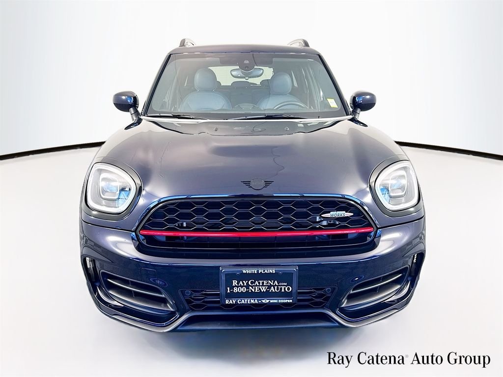 This 2023 MINI John Cooper Works Countryman All4 is a certified used vehicle with a Black Metallic exterior and Indigo interior. It features a 2.0L I4 DOHC 16V engine and comes with a CARFAX History Report. The vehicle offers a sporty look with JCW Grip Spoke Black Alloy wheels and a sport suspension, providing a comfortable and connected driving experience.