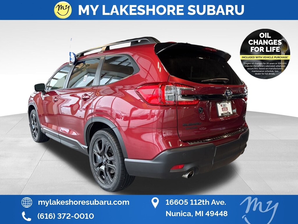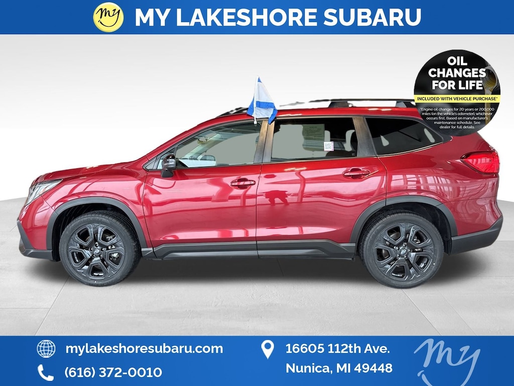 Ascent Onyx Edition, Crimson Red Pearl, all wheel drive, Apple CarPlay & Android Auto, EyeSight Driver Assist, lane departure warning, leather heated power seats, local trade, oil changes for life, panoramic moonroof. Certified. Crimson Red Pearl 2023 Subaru Ascent Onyx Edition AWD Lineartronic CVT 2.4L 4-Cylinder DOHC 16V. My Lakeshore Subaru is your #1 choice in Michigan to get the best price on used vehicles and best value for your trade. The My Lakeshore Subaru team is ready to provide you with a world-class experience, ensuring that you find the perfect vehicle that fits all your needs. Every vehicle has been through a full safety inspection completed by certified technicians and fully detailed. Odometer is 1186 miles below market average!