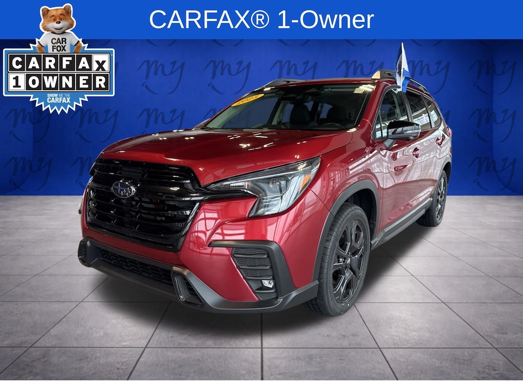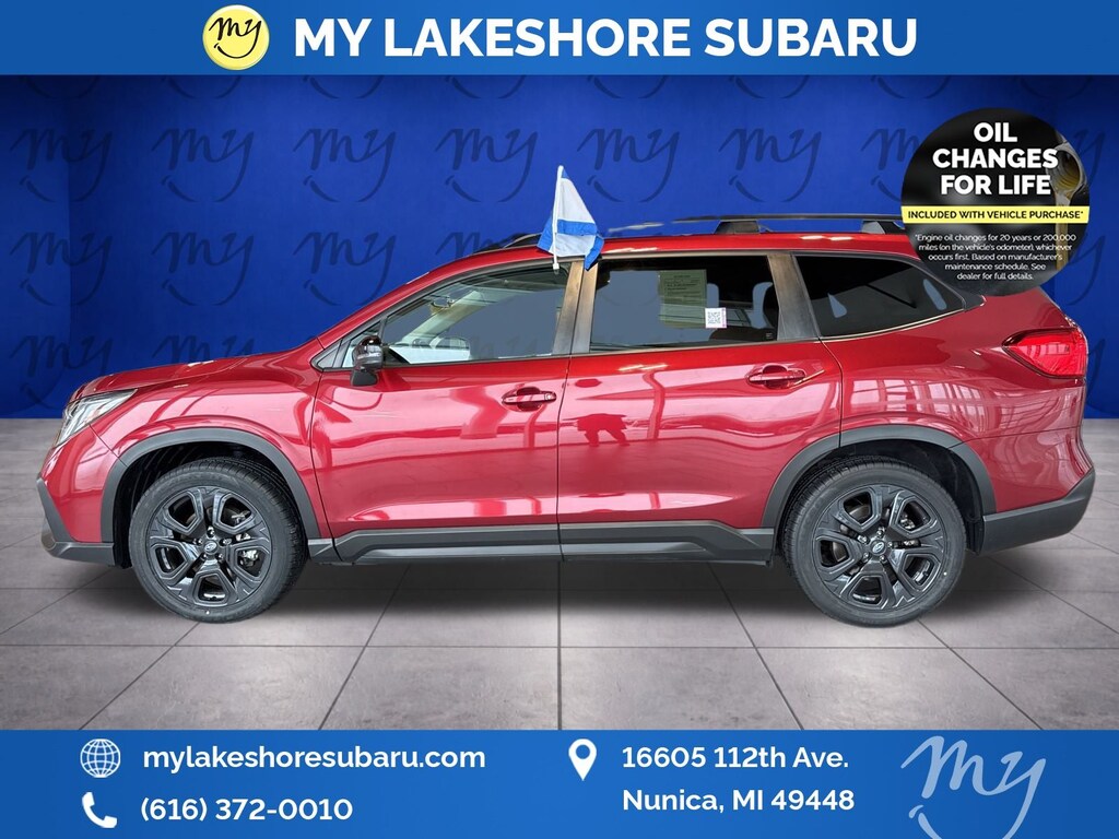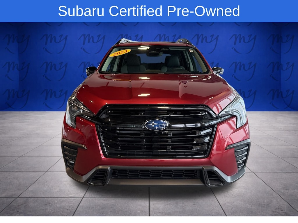 Ascent Onyx Edition, Crimson Red Pearl, all wheel drive, Apple CarPlay & Android Auto, EyeSight Driver Assist, lane departure warning, leather heated power seats, local trade, oil changes for life, panoramic moonroof. Certified. Crimson Red Pearl 2023 Subaru Ascent Onyx Edition AWD Lineartronic CVT 2.4L 4-Cylinder DOHC 16V. My Lakeshore Subaru is your #1 choice in Michigan to get the best price on used vehicles and best value for your trade. The My Lakeshore Subaru team is ready to provide you with a world-class experience, ensuring that you find the perfect vehicle that fits all your needs. Every vehicle has been through a full safety inspection completed by certified technicians and fully detailed. Odometer is 1186 miles below market average!