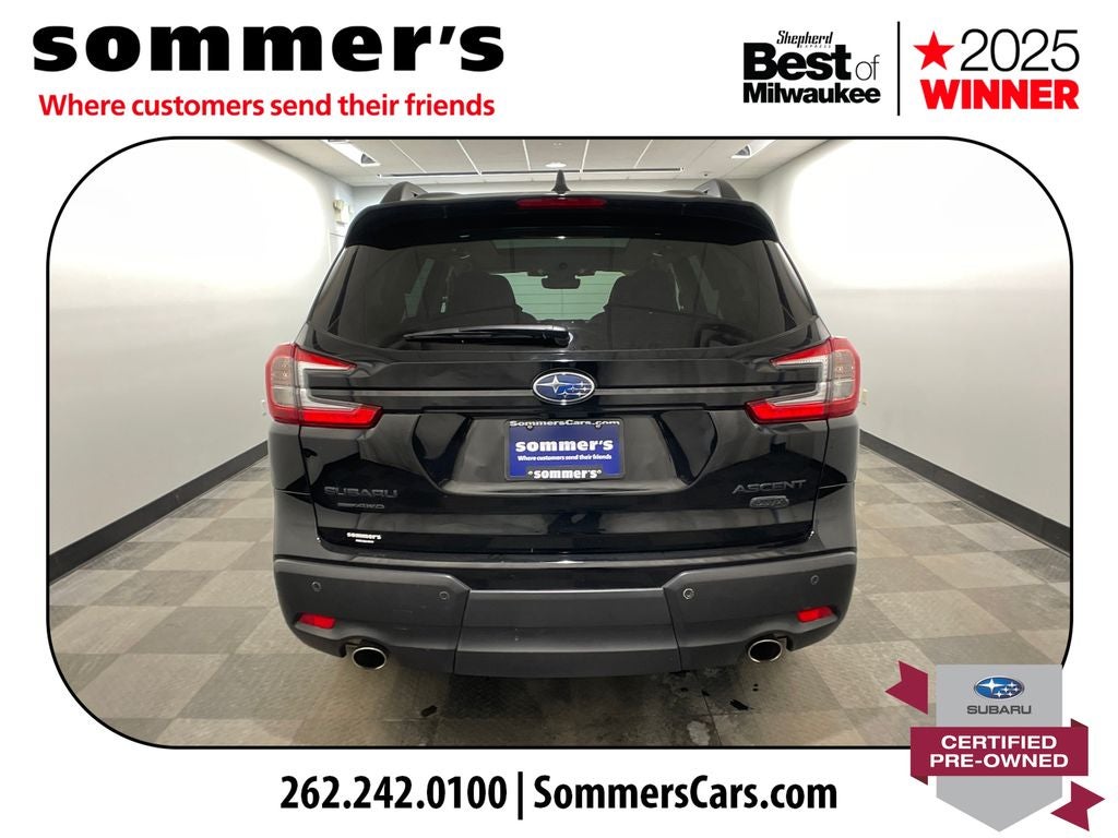 2023 Subaru Ascent Onyx Edition Certified Pre-Owned, One Owner - AWD, 2.4L turbo, 19/25 MPG, panoramic roof, heated seats, power liftgate, Apple CarPlay/Android Auto. Subaru Symmetrical AWD and a turbo 2.4L BOXER deliver confident traction with smooth CVT response. EPA-rated 19/25 MPG balances family space with road-trip efficiency. Heated front seats and a heated steering wheel warm winter starts, while the power driver seat fine-tunes support. Hands full? The power liftgate, keyless entry, and push-button start simplify loading and go. Apple CarPlay and Android Auto mirror your apps for easy maps, calls, and music. Wi-Fi hotspot, Bluetooth®, HD and satellite radio, and steering-wheel audio controls keep everyone connected. EyeSight features help watch the road with Front Collision Mitigation, Lane Departure Warning, and Lane Keep Assist. Blind Spot Monitor, back-up camera, stability/traction control, and a full airbag array add confidence. Crystal Black Silica paint, LED headlights, auto high beams, fog lamps, aluminum wheels, privacy glass, and a tow hitch give it a rugged, upscale look. Panoramic roof brightens a versatile 3rd row with captains chairs, plus cargo shade and concealed storage. Surefooted, quiet, and easygoing for families and weekend towing.