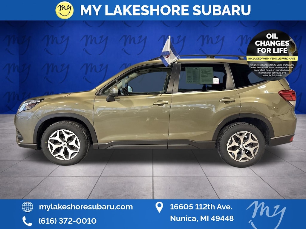 Forester Premium, Autumn Green Metallic, All wheel drive, Apple CarPlay & Android Auto, EyeSight Driver Assist, Heated seats, Lane departure warning, Oil changes for life, Panoramic moonroof. Certified. Autumn Green Metallic 2023 Subaru Forester Premium AWD Lineartronic CVT 2.5L 4-Cylinder DOHC 16V. My Lakeshore Subaru is your #1 choice in Michigan to get the best price on used vehicles and best value for your trade. The My Lakeshore Subaru team is ready to provide you with a world-class experience, ensuring that you find the perfect vehicle that fits all your needs. Every vehicle has been through a full safety inspection completed by certified technicians and fully detailed. We sell many makes and models, Certified Pre-owned Subarus and Pre-owned Vehicles with years from 2025-2024-2023-2022-2021-2020-2019-2018-2017-2016-2015-2014-2013-2012-2011-2010-2009-2008-2007 and all makes Audi, BMW, Chevrolet, Toyota, Volkswagen, Kia, Hyundai, Mazda, Mercedes, Dodge, Chrysler, Jeep, Ram, Lincoln, Honda, Subaru, and many models like Crosstrek, Outback, Forester, Accent, Legacy, WRX, BRZ, Solterra, and more. Take advantage of our VIP experience by calling 231-867-6957 to schedule a test drive. Read our customer reviews and view our entire selection of preowned vehicles at www.mylakeshoresubaru.com, or stop by today, located at 16605 112th Ave, Nunica, MI 49448. Recent Arrival! 26/33 City/Highway MPG.