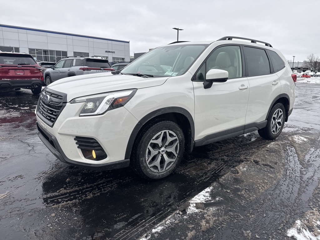 Recent Arrival! Carfax 1-Owner. 2023 Subaru Forester Premium Crystal White Pearl. Lineartronic CVT AWD 2.5L 4-Cylinder DOHC 16V. Coming Soon! This vehicle has recently been acquired and we are currently processing the paperwork, servicing the vehicle, and taking more photos. It will be available for sale and delivery shortly. See a store manager for specific details on the current status. IMPORTANT RECALL INFORMATION. Some vehicles may be subject to unrepaired safety recalls. Go to www.safercar.gov to learn whether an individual vehicle is subject to an open recall.