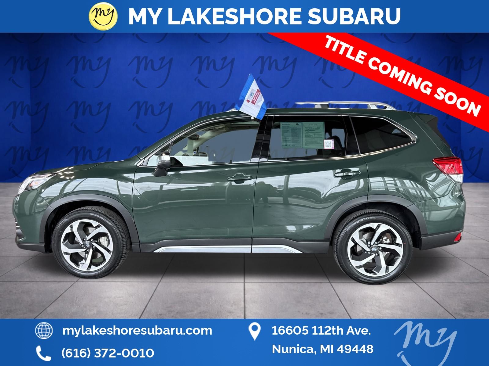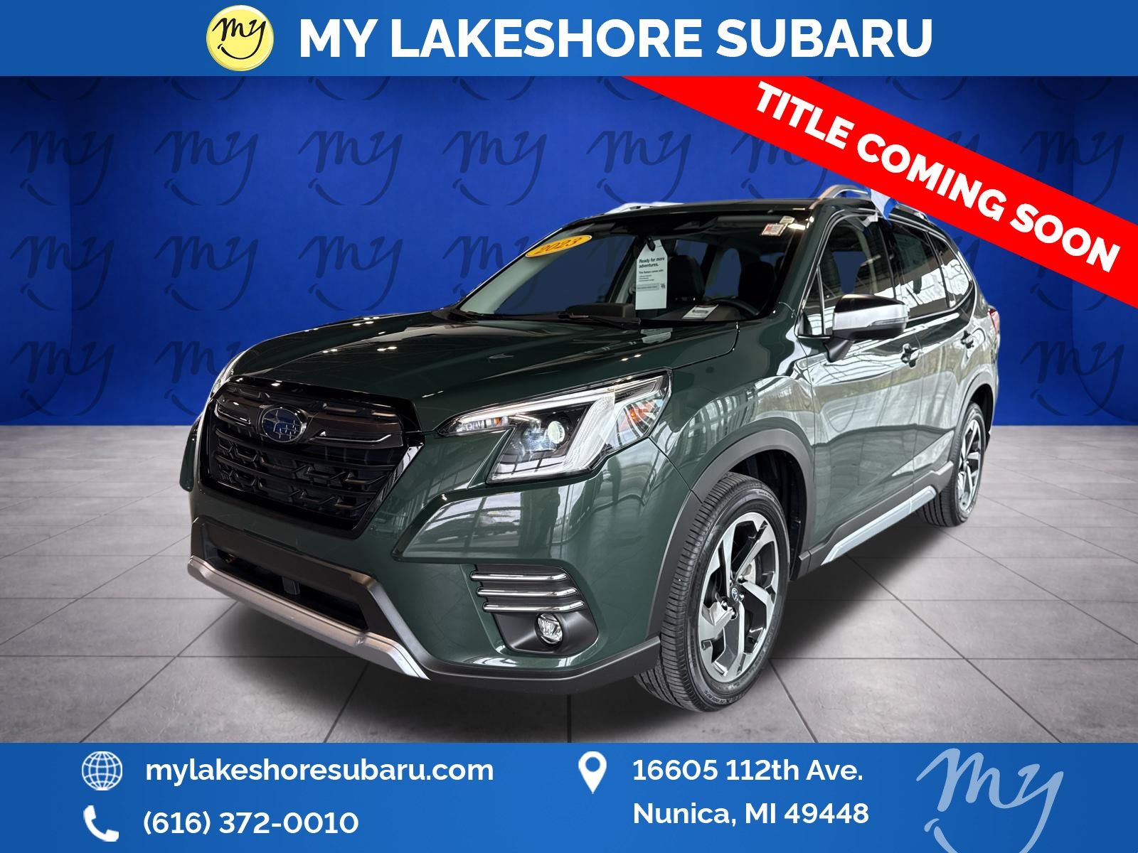 Forester Touring, Cascade Green Silica, All wheel drive, Apple CarPlay & Android Auto, Backup camera, Blind spot alert, EyeSight Driver Assist, Heated rear seats, Heated steering wheel, Lane departure warning, Leather heated power seats, Local trade, Oil changes for life, Panoramic moonroof, Premium sound. Certified. Cascade Green Silica 2023 Subaru Forester Touring AWD Lineartronic CVT 2.5L 4-Cylinder DOHC 16V. My Lakeshore Subaru is your #1 choice in Michigan to get the best price on used vehicles and best value for your trade. The My Lakeshore Subaru team is ready to provide you with a world-class experience, ensuring that you find the perfect vehicle that fits all your needs. Every vehicle has been through a full safety inspection completed by certified technicians and fully detailed. Recent Arrival! Odometer is 16277 miles below market average! 26/33 City/Highway MPG.