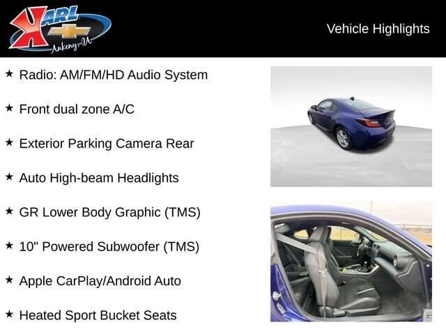 This 2023 Toyota GR86 Premium Premium Auto is a true driver's delight. With its powerful 2.4L I4 DOHC engine and smooth 6-speed automatic transmission, this rear-wheel-drive sports car delivers an exhilarating driving experience. The stunning blue exterior is complemented by a wealth of premium features, including dual-zone climate control, a premium audio system, and heated sport bucket seats. Slip behind the wheel and you'll be captivated by the GR86's responsive handling and precise steering, making every drive an adventure. The GR86's low center of gravity and lightweight design provide a thrilling and engaging driving experience, whether you're carving through winding roads or simply commuting to work. Beyond its dynamic performance, the GR86 Premium Premium Auto offers an impressive array of advanced technologies and convenience features. Enjoy the convenience of Apple CarPlay and Android Auto, as well as the added security of features like the rear parking camera and auto high-beam headlights. This GR86 Premium Premium Auto is a true gem, offering the perfect blend of style, performance, and technology. With its low mileage and comprehensive CarBravo Certified warranty, this vehicle is sure to provide years of driving enjoyment. Don't miss your chance to experience the thrill of the GR86 schedule a test drive today! At Karl Chevrolet we want to help you find the best new or used car in Ankeny that suits your needs. When you buy a new car at Karl Chevrolet you know you're finding a vehicle you can rely on. We have a great selection of Platinum Quality Pre-Owned Vehicles. We also pride ourselves in creating a friendly atmosphere and a reliable Dealership that you can trust. Call us and our experts will be glad to help you!