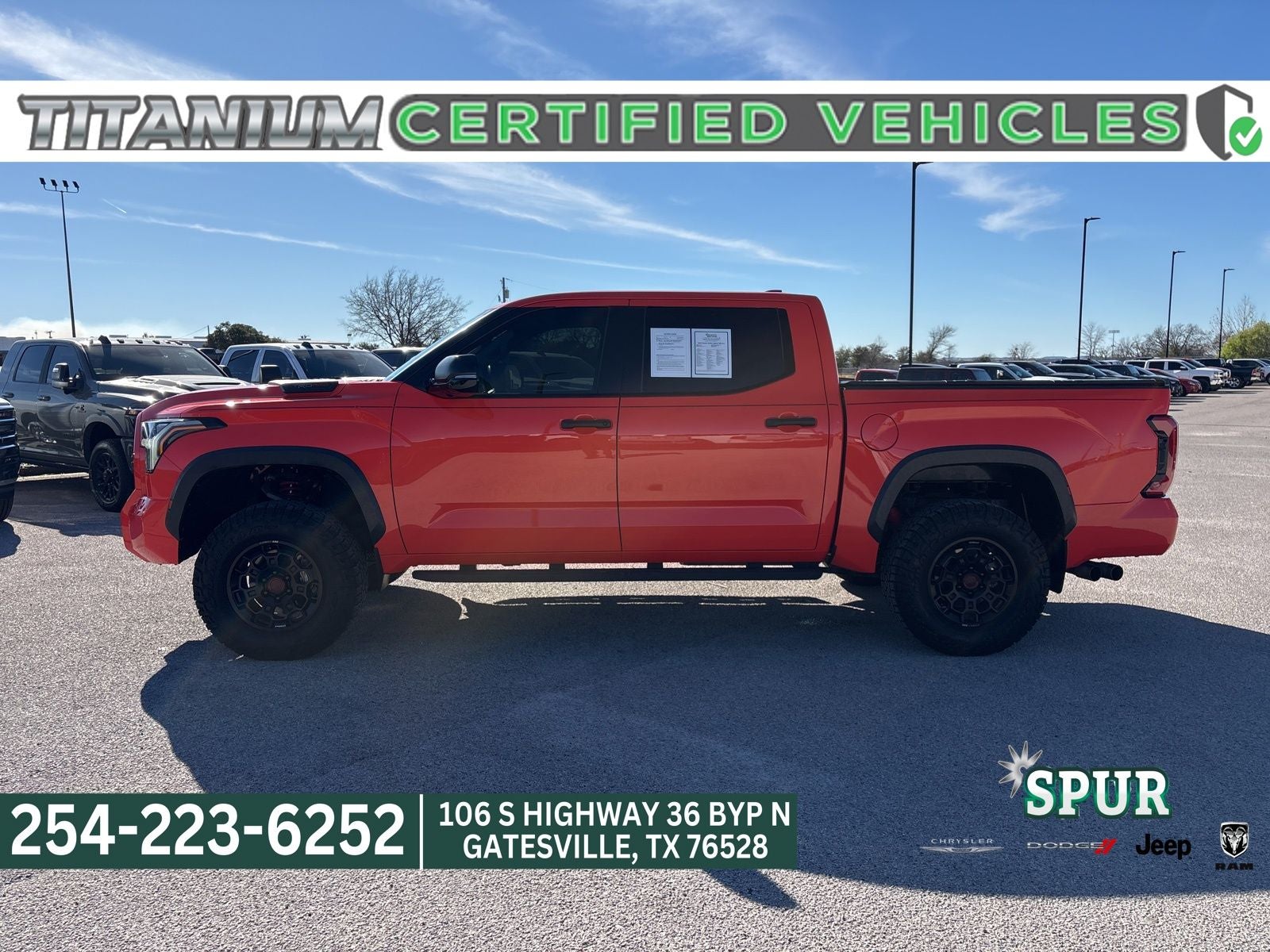Recent Arrival! Tundra Hybrid TRD Pro, 4D Crew Cab, 10-Speed Automatic, 4WD, Orange, 400W/120V AC Rear Seat & Bed Power Supply, Automatic temperature control, Black Dual Exhaust Tips w/Debossed TRD Pro Logo, Front & Rear Mud Guards, Heated Color-Keyed Outside Mirrors, LED Lightbar w/Fog & Marker Lights, Memory seat, Multi-Terrain Back Monitor, Navigation System, Power Panoramic Roof, Qi-Compatible Wireless Smartphone Charger, Smoked-Finish Premium LED Headlights & DRL, Towing Technology Package, TRD Pro Heated Leather-Trimmed Steering Wheel, TRD Pro Package. This 2023 Toyota Tundra Hybrid TRD Pro in Orange comes with the following features: Towing Technology Package, TRD Pro Package (400W/120V AC Rear Seat & Bed Power Supply, Black Dual Exhaust Tips w/Debossed TRD Pro Logo, Front & Rear Mud Guards, Heated Color-Keyed Outside Mirrors, LED Lightbar w/Fog & Marker Lights, Multi-Terrain Back Monitor, Power Panoramic Roof, Qi-Compatible Wireless Smartphone Charger, Smoked-Finish Premium LED Headlights & DRL, and TRD Pro Heated Leather-Trimmed Steering Wheel), Tundra Hybrid TRD Pro, Titanium Certified Certified, 4D Crew Cab, 10-Speed Automatic, 4WD, Orange, Automatic temperature control, Memory seat, Navigation System. Odometer is 8361 miles below market average! Certified. Certification Program Details: • 2 Year/100,000 mile Limited Powertrain with A/C coverage • 165-plus point Quality Assurance performed by a Certified Factory and ASE Trained Technician • Reconditioned to the Gilchrist Automotive Dealership Network’s exacting standards by our Factory and ASE trained Technicians • Complimentary Roadside Assistance • Complimentary Carfax Report • Powertrain Warranty is honored at most all major New Vehicle Dealerships and Service Centers • Vehicle are eligible for Comprehensive Service Contract coverage available for purchase. When you buy from SPUR CDJR, you are purchasing with peace of mind, knowing that each vehicle has been inspected and serviced by our Certified Technicians. We service all surrounding areas to include Waco, Temple, Bryan, College Station, and Killeen! Every vehicle we sell comes with a vehicle-specific folder that includes an inspection report, a free Carfax report.