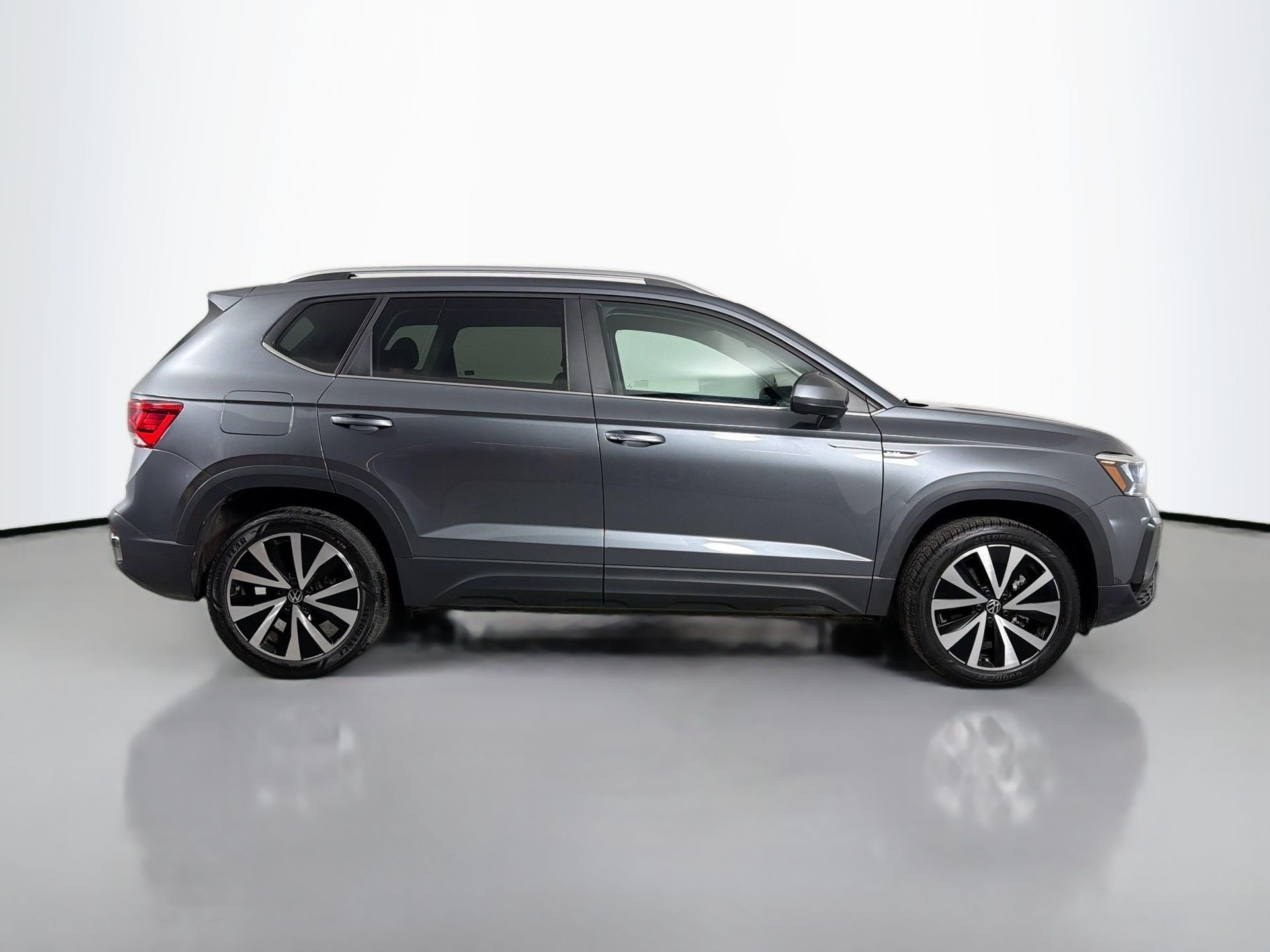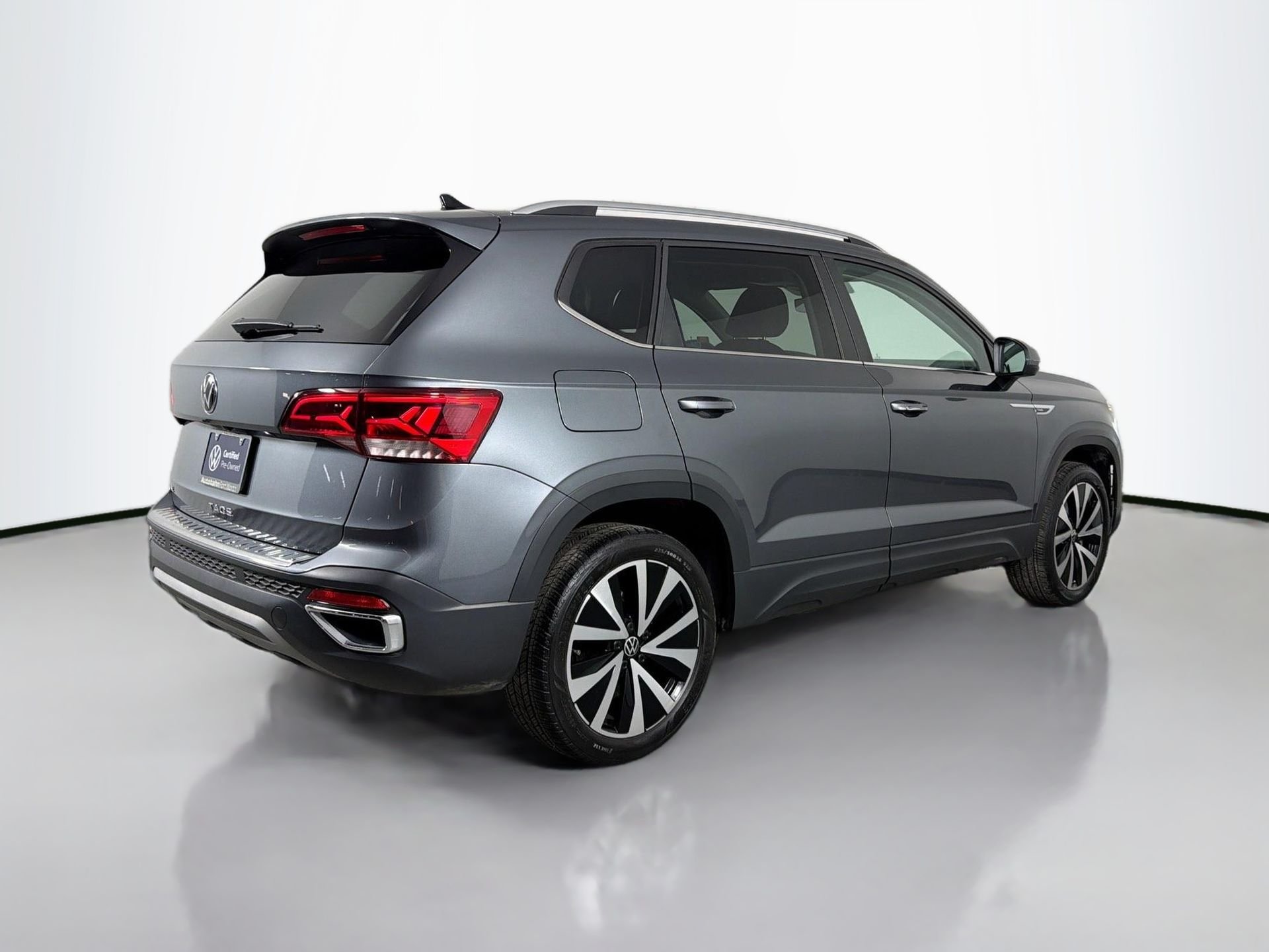 Certified. 2023 Volkswagen Taos 1.5T SE Platinum Gray Metallic. This 2023 Volkswagen Taos 1.5T SE in Platinum Gray Metallic comes with the following features: 1.5L I4 Turbocharged DOHC 16V LEV3-SULEV30 158hp 8-Speed Automatic with Tiptronic FWD Volkswagen Certified Pre-Owned Certified Volkswagen Certified Pre-Owned Certified, 3.23 Axle Ratio, 4-Wheel Disc Brakes, 6 Speakers, ABS brakes, Active Blind Spot Monitor, Air Conditioning, Alloy wheels, AM/FM radio: SiriusXM with 360L, Auto High-beam Headlights, Brake assist, Bumpers: body-color, CloudTex & Cloth Seating Surfaces, Compass, Delay-off headlights, Driver door bin, Driver vanity mirror, Dual front impact airbags, Dual front side impact airbags, Electronic Stability Control, Emergency communication system: VW Car-Net Safe & Secure 5-year, Exterior Parking Camera Rear, Front anti-roll bar, Front Bucket Seats, Front Center Armrest, Front reading lights, Front Strut Rear Torsion Beam Suspension, Front wheel independent suspension, Fully automatic headlights, Heated door mirrors, Heated Front Comfort Seats, Heated front seats, Heated steering wheel, Illuminated entry, Leather Shift Knob, Low tire pressure warning, Occupant sensing airbag, Outside temperature display, Overhead airbag, Overhead console, Panic alarm, Passenger door bin, Passenger vanity mirror, Power door mirrors, Power driver seat, Power steering, Power windows, Radio data system, Radio: MIB3 Composition Media AM/FM/HD, Rain sensing wipers, Rear anti-roll bar, Rear seat center armrest, Rear window defroster, Rear window wiper, Remote keyless entry, Roof rack: rails only, Security system, Speed control, Speed-sensing steering, Split folding rear seat, Spoiler, Steering wheel mounted audio controls, Tachometer, Telescoping steering wheel, Tilt steering wheel, Traction control, Trip computer, Variably intermittent wipers, and Wheels: 18" 2-Tone Machined Alloy.