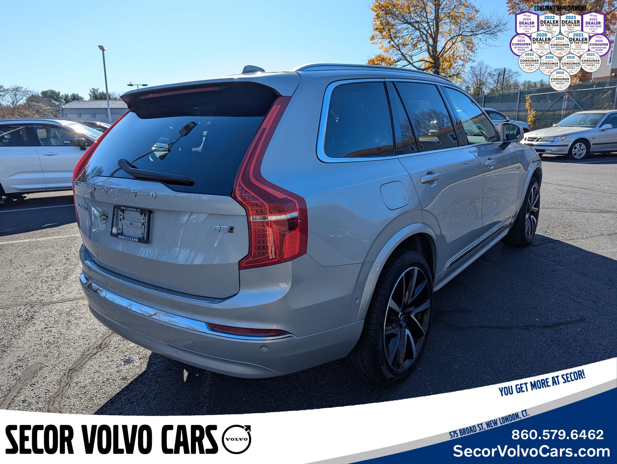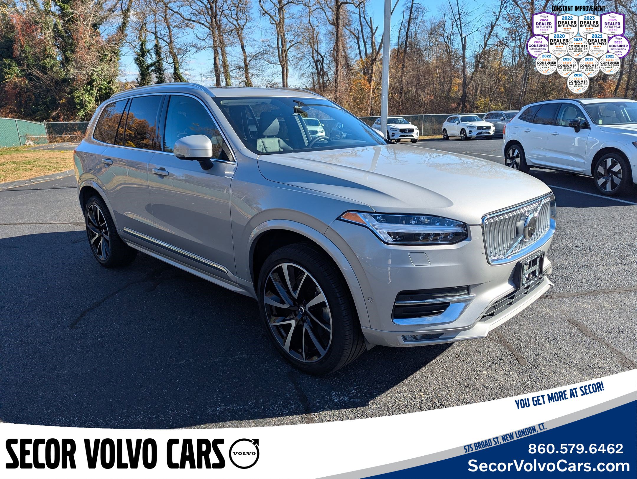 2023 Volvo XC90 B5 Plus Certified. 22/28 City/Highway MPG Clean CARFAX. CARFAX One-Owner. Secor Volvo Received the 2025 CT Volvo Dealer of the Year Award for the 6th consecutive year as well as the 2025 Consumer Satisfaction Award for the 8th year in a row - Consumer Satisfaction Awards recognize the top 10% of auto dealerships delivering exceptional customer service. Did you know? Volvo has used American Chiropractic Association Certified Seats Since 1999? Just one of the reasons that once you own a Volvo, you always own a Volvo. Silver Dawn Metallic 2.0L I4 Turbocharged DOHC 16V LEV3-ULEV70 AWD Automatic with Geartronic. At Secor Volvo we take pride in knowing that our team continually strives to do the best by our customers. We are a family owned and operated business and we would like the opportunity to earn your business. Please call us today at 860.442.3232 to speak to Bear Dalton and his team or visit us at https://www.secorvolvocars.com/. Secor Volvo Cars - The Family Place. Please call us to confirm pricing. This site, and all information and materials appearing on it, are presented to the user as is without warranty of any kind, either express or implied, including but not limited to the implied warranties of merchantability, fitness for a particular purpose, title or non-infringement. All vehicles are subject to prior sale. Price does not include applicable sales tax, title, license, and $749 dealer conveyance fee. Not responsible for typographical errors.