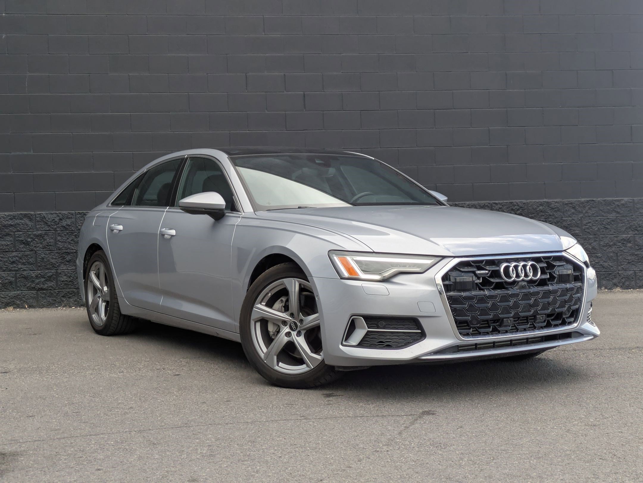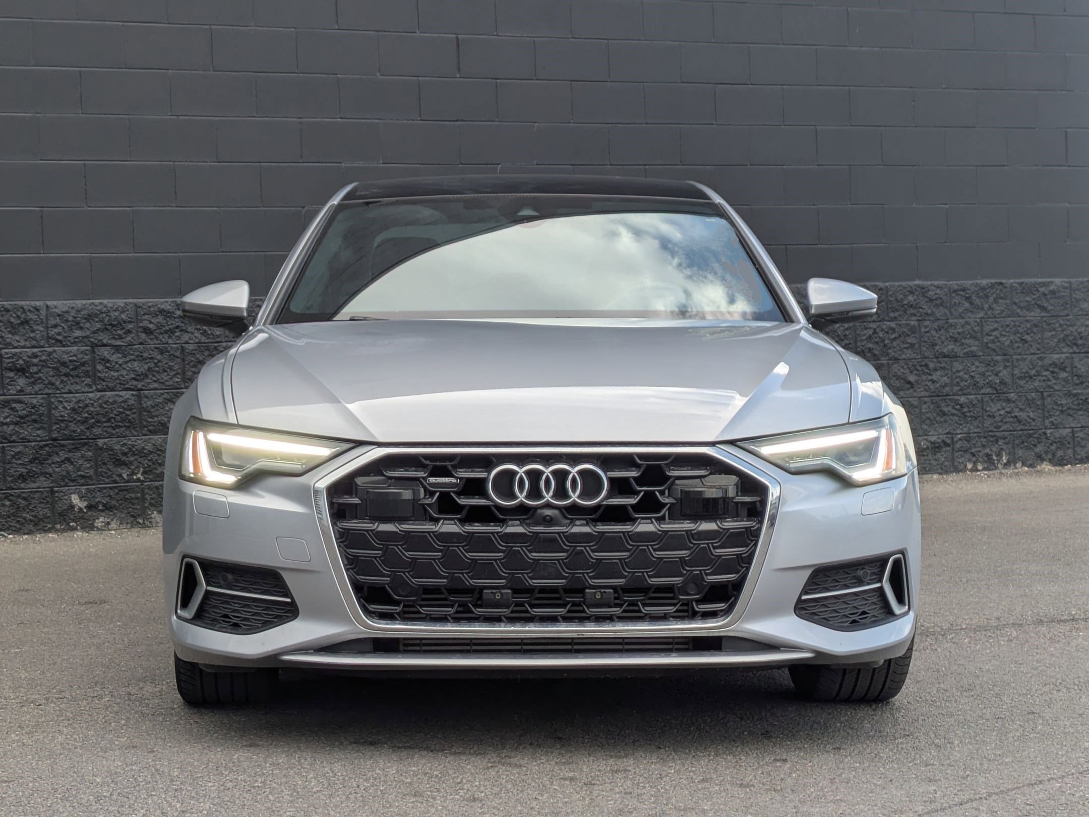 Certified. Florett Silver Metallic 2024 Audi A6 45 Premium Plus quattro quattro 7-Speed Automatic 2.0L 4-Cylinder TFSI Audi Certified pre-owned Certified, quattro, Black w/Leather Seating Surfaces, 10 Speakers, 4-Wheel Disc Brakes, ABS brakes, Air Conditioning, Alloy wheels, AM/FM radio: SiriusXM w/ 360L, Auto High-beam Headlights, Auto tilt-away steering wheel, Auto-dimming door mirrors, Auto-dimming Rear-View mirror, Automatic temperature control, Brake assist, Bumpers: body-color, Compass, Delay-off headlights, Driver door bin, Driver vanity mirror, Dual front impact airbags, Dual front side impact airbags, Electronic Stability Control, Emergency communication system: Audi connect CARE (limited time subscription), Exterior Parking Camera Rear, Four wheel independent suspension, Front anti-roll bar, Front Bucket Seats, Front Center Armrest, Front dual zone A/C, Front fog lights, Front reading lights, Garage door transmitter: HomeLink, Genuine wood console insert, Genuine wood dashboard insert, Genuine wood door panel insert, Heated door mirrors, Heated Front Seats, Heated front seats, Illuminated entry, Knee airbag, Leather Seating Surfaces, Leather Shift Knob, Leather steering wheel, Low tire pressure warning, Memory seat, Navigation system: Audi connect NAV & PLUS, Occupant sensing airbag, Outside temperature display, Overhead airbag, Overhead console, Panic alarm, Passenger door bin, Passenger vanity mirror, Power door mirrors, Power driver seat, Power moonroof, Power passenger seat, Power steering, Power windows, Radio data system, Radio: Audi MMI Nav Plus w/MMI Touch Response, Rain sensing wipers, Rear air conditioning, Rear anti-roll bar, Rear reading lights, Rear seat center armrest, Rear side impact airbag, Rear window defroster, Remote keyless entry, Security system, Speed control, Speed-sensing steering, Speed-Sensitive Wipers, Split folding rear seat, Steering wheel memory, Steering wheel mounted audio controls, Tachometer, Telescoping steering wheel, Tilt steering wheel, Traction control, Trip computer, Turn signal indicator mirrors, Variably intermittent wipers, Wheels: 19 5-Arm Platinum Gray Dynamic Design.