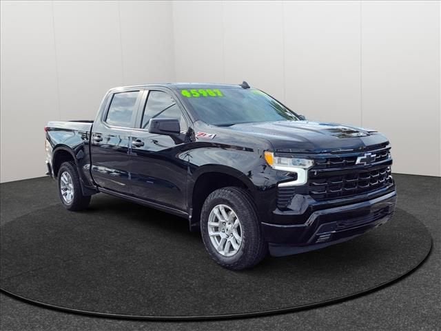 Certified. GM Details:* Warranty Deductible: $0* Vehicle History* Limited Warranty: 12 Month/12,000 Mile (whichever comes first) from certified purchase date* 24 months/24,000 miles (whichever comes first) Certified Pre-Owned Scheduled Maintenance Plan and 3 days/150 miles (whichever comes first) Vehicle Exchange Program. SiriusXM 3-month trial subscription.* Powertrain Limited Warranty: 72 Month/100,000 Mile (whichever comes first) from original in-service date* Transferable Warranty* 172 Point Inspection* Roadside AssistanceCARFAX One-Owner. Clean CARFAX.Black 2024 Chevrolet Silverado 1500 RST 4D Crew Cab 4WD 10-Speed Automatic EcoTec3 5.3L V8 Local Trade In, Fresh Oil Change, Silverado 1500 RST, 4D Crew Cab, EcoTec3 5.3L V8, 10-Speed Automatic, 4WD, Black, Jet Black w/Cloth Seat Trim, 10-Way Power Driver Seat w/Lumbar, 12.3 Multicolor Reconfigurable Digital Display, 120-Volt Bed Mounted Power Outlet, 120-Volt Interior Power Outlet, 170 Amp Alternator, 220 Amp Alternator, 3.23 Rear Axle Ratio, 4-Wheel Disc Brakes, 40/20/40 Front Split-Bench Seat, 6 Speakers, 6-Speaker Audio System, ABS brakes, Air Conditioning, All-Star Edition, All-Weather Floor Liner (LPO) (AAK), Alloy wheels, AM/FM radio: SiriusXM with 360L, Auto High-beam Headlights, Auto-Locking Rear Differential, Automatic Emergency Braking, Automatic temperature control, Auxiliary External Transmission Oil Cooler, Bluetooth® For Phone, Brake assist, Bumpers: body-color, Chevrolet Connected Access Capable, Cloth Seat Trim, Color-Keyed Carpeting Floor Covering, Compass, Convenience Package, Deep-Tinted Glass, Delay-off headlights, Driver door bin, Driver vanity mirror, Dual Exhaust w/Black Exhaust Tips, Dual Exhaust w/Polished Outlets, Dual front impact airbags, Dual front side impact airbags, Dual Rear USB Ports (Charge Only), Dual-Zone Automatic Climate Control, Electric Rear-Window Defogger, Electrical Steering Column Lock, Electronic Cruise Control, Electronic Stability Control, External Engine Oil Cooler, EZ Lift Power Lock & Release Tailgate, Following Distance Indicator, Forward Collision Alert, Front anti-roll bar, Front Center Armrest w/Storage, Front dual zone A/C, Front fog lights, Front Frame-Mounted Black Recovery Hooks, Front LED Fog Lamps, Front License Plate Kit, Front Pedestrian Braking, Front reading lights, Front Rubberized Vinyl Floor Mats, Front wheel independent suspension, Fully automatic headlights, HD Rear Vision Camera, Heated door mirrors, Heated Driver & Front Outboard Passenger Seats, Heated front seats, Heated Power-Adjustable Outside Mirrors, Heated Steering Wheel, Heated steering wheel, Heavy-Duty Air Filter, High Gloss Black Mirror Caps, Hill Descent Control, Hitch Guidance, Illuminated entry inside rear-View Mirror w/Tilt.