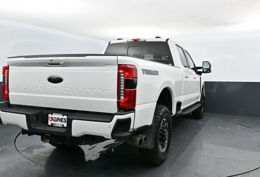 6.7L High Output Power Stroke V8 diesel engine. Tremor Off-Road Package with front and rear wheel well liners, skid plates, and vented all-weather floor mats. Power moonroof with twin panel glass. Black appearance package with painted aluminum 18-inch wheels. Upfitter switches and tailgate step. Ultimate leather seating with max recline driver/passenger seats. B&O premium audio system. Power sliding rear window with defrost and privacy tint. Advanced safety features with blind spot monitoring, cross-traffic alert, lane keeping alert, and pre-collision assist. Rear parking sensors and backup camera. Adaptive cruise control. Heated and ventilated front seats. Heated rear seats. Remote start system. Power-deployable running boards. Spray-in bedliner. Dual 78 AH AGM batteries. Trailer brake controller and trailer sway control. Bed hooks and roadside assistance kit. SiriusXM with 12-inch SYNC 4 touchscreen. Black Onyx leather interior.