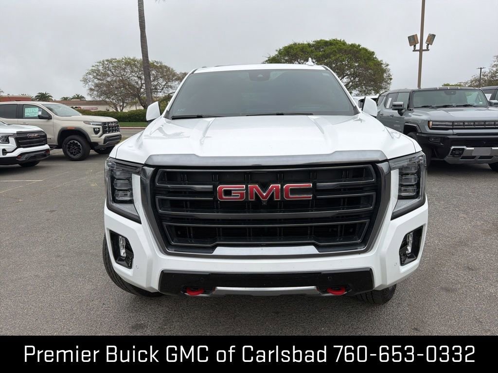 www.carlsbadbuick.com. Certified. Summit White Yukon AT4 4WD 10-Speed Automatic with Overdrive EcoTec3 6.2L V8 4WD, 12-Way Power Seat Adjusters, 15 Diagonal Multi-Color Head-Up Display, 2 Presets For Outside Rearview Mirrors, 3rd Row 60/40 Power-Folding Split-Bench Seat, Apple CarPlay/Android Auto, Black Roof-Mounted Luggage Rack Side Rails, Bose 9-Speaker Stereo Audio System Feature, Bright Front & Rear Door Sill Plates, Dual-Pane Panoramic Power Sunroof, Front High-Approach Angle Fascia, Hands-Free Power Programmable Rear Liftgate, HD Surround Vision, Heated Driver & Front Passenger Seats, Heated Steering Wheel, Heavy-Duty Air Filter, Hill Descent Control, Inside Rear-View Auto-Dimming Mirror, Outside Heated Power-Adjustable Mirrors, Perforated Heated & Ventilated Dr & Frt Pass Seats, Power Liftgate, Power Release 2nd Row 60/40 Split-Folding Bench Seat, Power Tilt & Telescopic Steering Column, Preferred Equipment Group 4SB, Rear Pedestrian Alert, Red Horizontal-Mounted Recovery Hooks, Safety Alert Seat, Technology Package, Universal Home Remote.