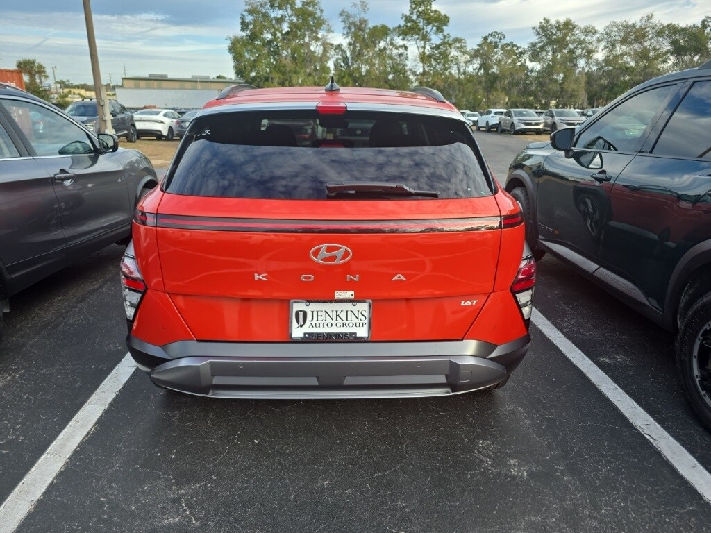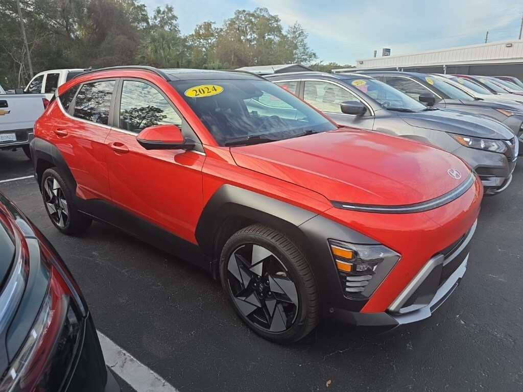 Certified Pre-Owned 2024 Hyundai Kona Limited in Soultronic Orange Pearl with a black interior. This SUV features a sunroof, heated leather seating, premium Bose audio, navigation system, lane departure warning, automatic temperature control, emergency communication system, power moonroof, wireless phone connectivity, parking sensors, exterior parking camera front, rear cross traffic collision warning, blind spot collision warning, active cruise control, proximity entry keyless system, push button start, surround view monitor, and a proximity entry keyless system. Enjoy peace of mind with Jenkins Nissan of Homosassa's exclusive nationwide lifetime unlimited mileage warranty. The price does not include tax, tag, license, an electronic filing fee, private tag agency fee, and predelivery service charge. EPA-estimate metric: these are contingent on ideal conditions within a lab. Real-world situations such as carrying passengers or cargo, using climate control, driving style, and ambient temperatures can affect actual metrics.