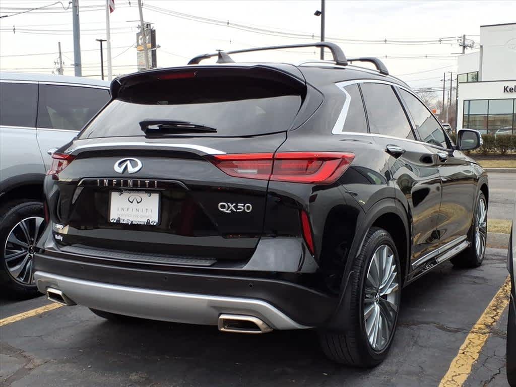 INFINITI Certified, Very Nice, ONLY 11,119 Miles! FUEL EFFICIENT 28 MPG Hwy/22 MPG City! Black Obsidian exterior and Graphite interior, Sensory trim. Heated/Cooled Leather Seats, Sunroof, NAV, Heated Rear Seat, Panoramic Roof, Power Liftgate, Wheels: 20 Silver Painted & Machine Finished, Cross Bars, All Wheel Drive, Serviced here, Originally bought here, Clean CARFAX report! Carfax One Owner. CLICK NOW! Service Work completed on this INFINITI QX50 included: Complete Multi-Point Inspection, Oil & Filter Change by a Factory Trained Technician, Battery Voltage Test, Windshield Wiper Blades Replaced, Tires Inspected, Brake Inspection, Engine Air Filter Replaced, Cabin Air Filter Replaced, Emissions System Check, Professional Detailed Inside and Out, Function Test all Lights, Check the Complete Exhaust System.