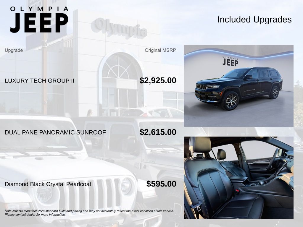 This vehicle is located at Olympia Jeep. Serving Olympia, Lacey, Tumwater, Shelton, Dupont, Tacoma, Yelm, Centralia, Chehalis. Discover the exceptional value and unparalleled features of this 2024 Jeep Grand Cherokee L Limited. This stunning SUV combines rugged capability, refined luxury, and cutting-edge technology, making it the ultimate choice for discerning drivers. Powered by a robust 3.6L V4 V6 engine and equipped with a smooth-shifting 8-speed transmission, this Grand Cherokee L delivers impressive performance and efficiency, with an EPA-estimated 18 city/25 highway MPG. Whether you're navigating the urban jungle or exploring off-road adventures, this 4WD SUV is up to the task. Step inside and be enveloped in the refined Capri Leatherette interior, complete with ventilated front seats and a dual-pane panoramic sunroof that floods the cabin with natural light. The Luxury Tech Group II package elevates your driving experience with features like the power tilt/telescoping steering column, surround-view camera system, and wireless charging pad. Safety is a top priority, with advanced systems like the Intersection Collision Assist and ParkSense Front/Rear Park Assist with Stop ensuring you and your loved ones are well-protected on the road. The rearview auto-dimming digital display mirror and rain-sensitive windshield wipers add an extra layer of convenience and peace of mind. This Jeep Grand Cherokee L Limited is a true gem, with a clean CARFAX report and the backing of Jeep's Certified Pre-Owned program. Enjoy the confidence of a 7-year/100,000-mile limited powertrain warranty, along with the assurance of a 125-point inspection and 24-hour roadside assistance. Don't miss the opportunity to experience the exceptional craftsmanship and uncompromising capabilities of this 2024 Jeep Grand Cherokee L Limited. Schedule a test drive today and discover why this SUV is the perfect blend of luxury, performance, and versatility.