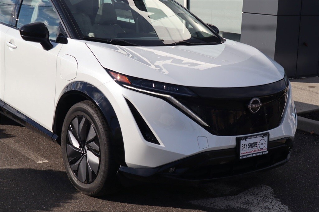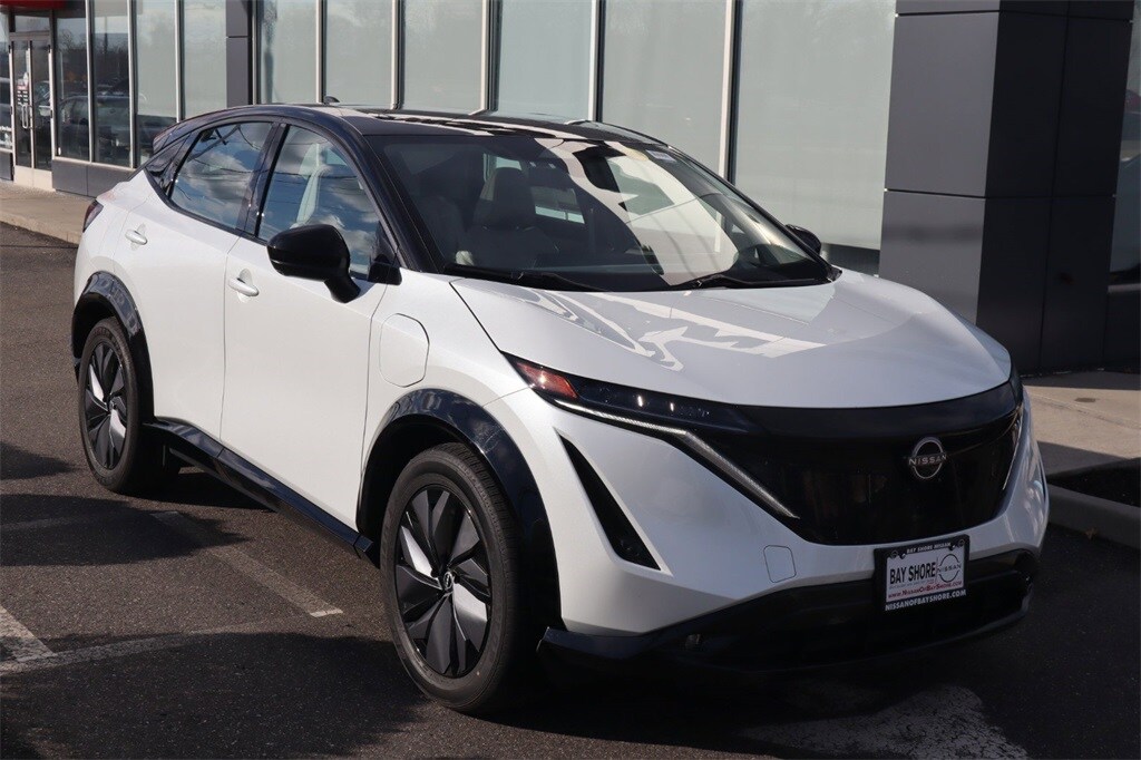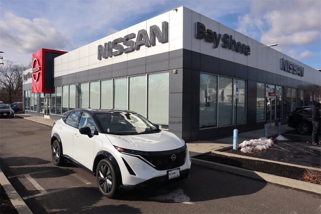 This Nissan ARIYA boasts an electric engine powering this automatic transmission. Hai Gray, leatherette seating surfaces, Everest White Pearl Tricoat/Black Diamond Pearl, [N92] illuminated kick plates. This Nissan ARIYA comes equipped with these options. [L92] Carpeted Floor Mats & First Aid Kit, [I92] illuminated kick plates, wireless phone connectivity, wing spoiler, wheels with aero wheel covers, vehicle dynamic control, trunk/hatch auto-latch, trip computer, transmission with driver selectable mode. A short visit to Nissan of Bay Shore located at 1521 Sunrise Hwy, Bay Shore, NY 11706 can get you a trustworthy ARIYA today!