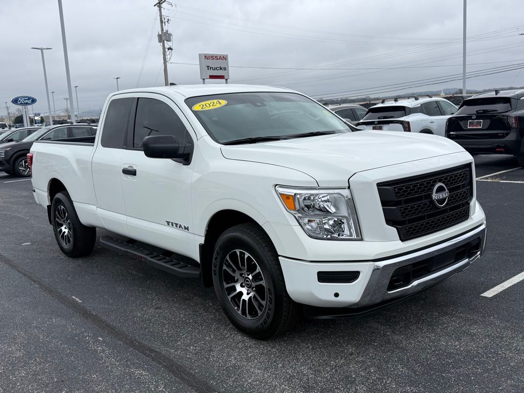 Introducing the 2024 Nissan Titan SV, a reliable powerhouse in Glacier White with an impressive 400hp 5.6L V8 engine and a smooth 9-speed automatic transmission. This King Cab marvel takes on heavy-duty challenges with ease, making it the ultimate pick for both work and play, every day. Whether you're tackling rough terrain or cruising city streets, the intelligent 4WD system ensures superb traction and control. Step inside, and you'll find the spacious interior with its bold black theme offers both ruggedness and comfort. The heated front Captain's Seats, wrapped in quality cloth trim, add a touch of luxury to every journey whether it's a daily commute or a weekend adventure. Enjoy the convenience of a power driver seat and thoughtful touches like a leather-wrapped steering wheel and ambient lighting for an elevated driving experience. Stay connected and entertained no matter where the road leads with the latest NissanConnect multimedia system. Featuring Apple CarPlay and Android Auto, you can easily access your favorite apps, music, and navigation through the intuitive touchscreen interface. The 6-speaker audio system delivers crisp, immersive sound, keeping the atmosphere vibrant on every drive. Safety is always paramount, and the Titan SV doesn't compromise. Feel securely guided with Nissan's Blind Spot Warning, allowing for greater confidence when changing lanes. The suite of airbags, including dual front, side, and knee coverage, along with the emergency communication system, ensures peace of mind mile after mile.