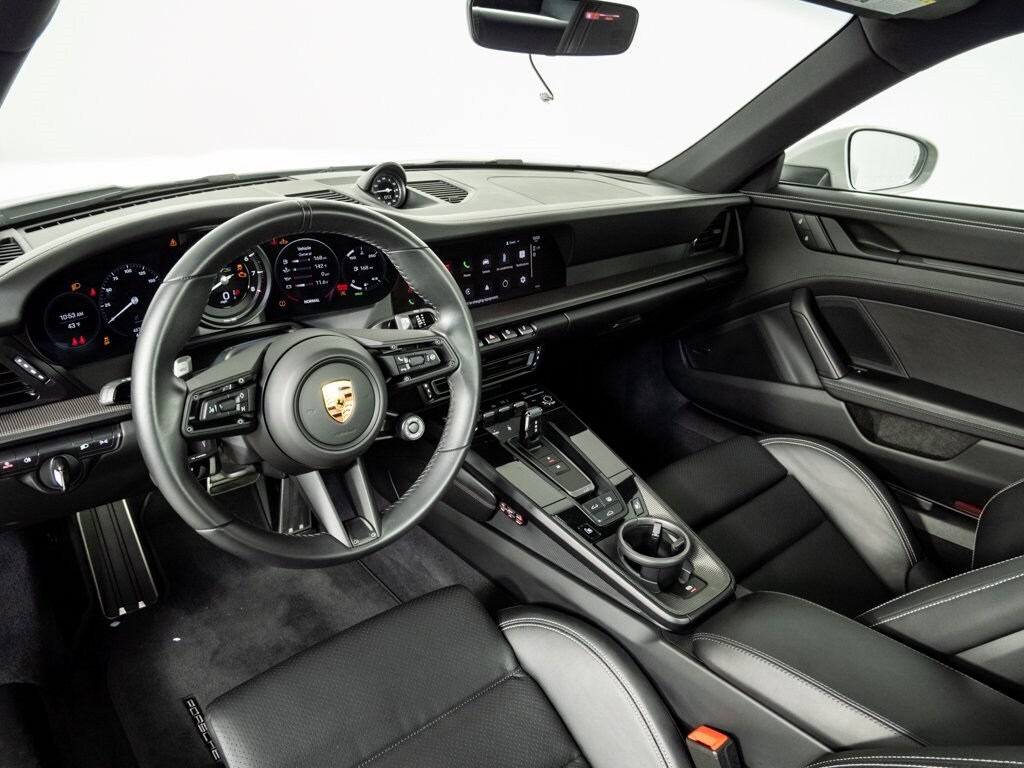 Finished in the highly sought-after Chalk exterior with an elegant Black leather interior accented by Chalk stitching, this 2024 Porsche 911 Carrera GTS captures the perfect balance of performance, refinement, and modern design. As part of the 992 generation, the Carrera GTS elevates the 911 driving experience with increased power, sport-oriented tuning, and an unmistakably athletic presence. This example is beautifully configured with the Premium Package, adding features such as Surround View, Lane Change Assist, ambient lighting, and a BOSE Surround Sound System. The cabin is further enhanced with Adaptive Sport Seats Plus (18-way), matte carbon fiber interior trim, and the GT Sport steering wheel, creating a driver-focused environment built for spirited driving and long-distance comfort alike. Equipped with the Front Axle Lift System, the car effortlessly navigates steep driveways and obstacles, while the Extended Range Fuel Tank increases practicality for longer journeys. An electric glass slide/tilt sunroof adds open-sky enjoyment, and the striking 20"/21" RS Spyder Design wheels in Satin Black complete the car’s purposeful stance. This 911 Carrera GTS delivers an ideal blend of high-performance capability, modern luxury, and unmistakable Porsche character—configured in one of the most desirable color combinations offered today.