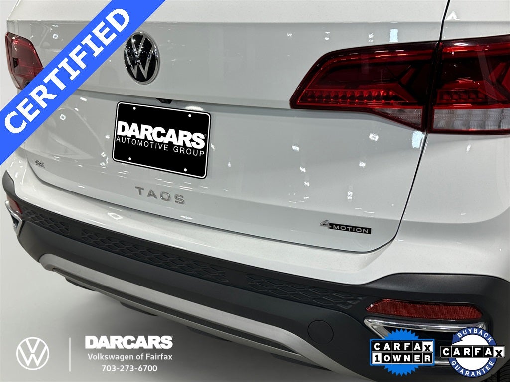2024 Volkswagen Taos 1.5T SE White AWD 7-Speed DSG Automatic with Tiptronic 1.5L I4 Turbocharged DOHC 16V LEV3-SULEV30 158hp. One owner, no accidents or damages reported. Certified pre-owned. Reaminging 36 months or 42,538 miles plus additional 24 months plus additional 24 months or 24,000 miles. Non smoker's car. Very low miles. Locally owned and serviced. Services through 30K. CARFAX One-Owner. Taos 1.5T SE w/ Sunroof, 4D Sport Utility, 1.5L I4 Turbocharged DOHC 16V LEV3-SULEV30 158hp, 7-Speed DSG Automatic with Tiptronic, AWD, White, Gray w/CloudTex & Cloth Seating Surfaces, 6 Speakers, Active Blind Spot Monitor, Alloy wheels, Auto High-beam Headlights, Automatic temperature control, Black Wheel Plus Package (DISC), Brake assist, Bumpers: body-color, CloudTex & Cloth Seating Surfaces, Delay-off headlights, Front dual zone A/C, Heated door mirrors, Heated Front Bucket Seats, Low tire pressure warning, Panoramic Sunroof Package, Power driver seat, Power windows, Radio data system, Radio: MIB3 Composition Media AM/FM/HD, Rain sensing wipers, Rear window defroster, Speed-sensing steering, Steering wheel mounted audio controls, Variably intermittent wipers, Wheels: 19 Black Painted Alloy (DISC). Certified. Recent Arrival! Odometer is 3300 miles below market average! 24/32 City/Highway MPG.
