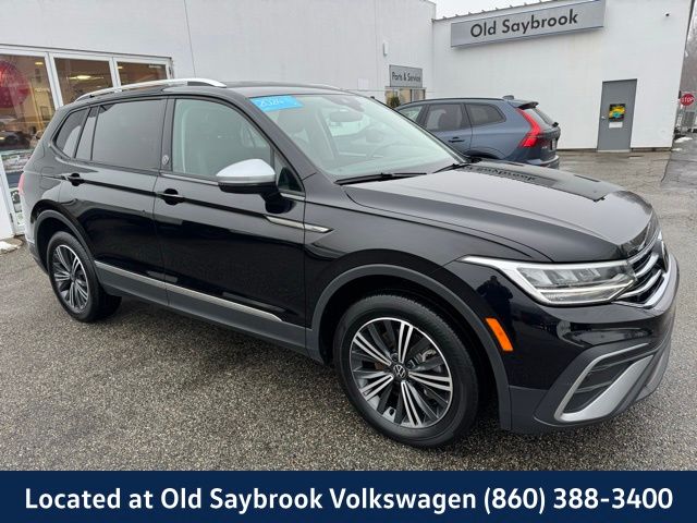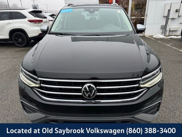 Certified Pre-Owned 2024 Volkswagen Tiguan 2.0T Wolfsburg Edition SUV. Located at Volkswagen of Old Saybrook. This vehicle features a Deep Black Pearl exterior and Titan Black interior. It is equipped with an 8-speed automatic transmission, all-wheel drive, and a 2.0L TSI engine. The Tiguan offers a comfortable and luxurious ride, advanced safety features, and a suite of connectivity options. Enjoy peace of mind with a 2-year warranty and 24000-mile coverage.