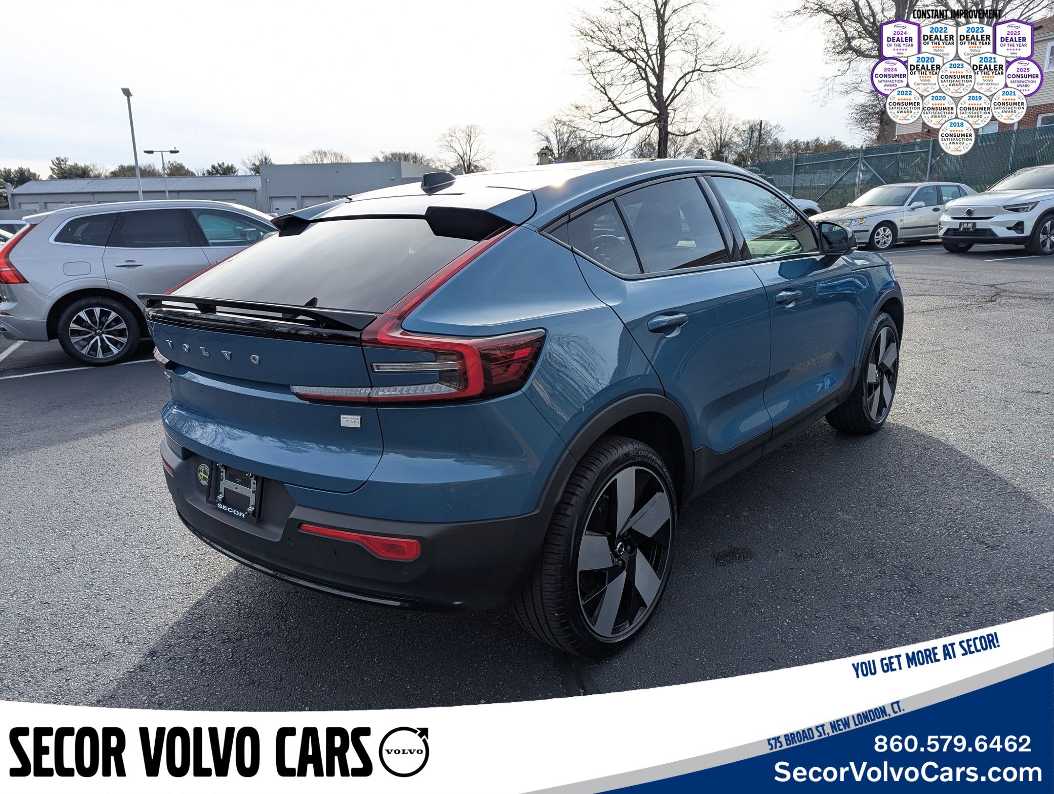 2024 Volvo C40 Recharge Pure Electric Ultimate Certified. 106/91 City/Highway MPG Clean CARFAX. CARFAX One-Owner. Secor Volvo Received the 2025 CT Volvo Dealer of the Year Award for the 6th consecutive year as well as the 2025 Consumer Satisfaction Award for the 8th year in a row - Consumer Satisfaction Awards recognize the top 10% of auto dealerships delivering exceptional customer service. Did you know? Volvo has used American Chiropractic Association Certified Seats Since 1999? Just one of the reasons that once you own a Volvo, you always own a Volvo. Fjord Blue Metallic Electric Motor AWD 1-Speed Automatic All-Weather Floor Mats, Cargo Tray, First Aid Kit, Protection Package Premier, Wheel Locks. Volvo Certified Pre-Owned Details: Roadside Assistance, Vehicle History, 170+ Point Inspection, 1-Year complimentary Volvo On Call app. Remote climate control, locks, fuel, maintenance & driving journal. Vehicle History Report with Buyback Guarantee. Includes Trip Interruption Reimbursement. Every Certified by Volvo Fully Electric & Plug-in Hybrid Comes With an 8-Year/100,000-Mile Battery Warranty. Warranty Deductible: $0. Limited Warranty: 12 Month/Unlimited Mile Upgradeable Up to 5 Years and Up to Unlimited Miles. Transferable Warranty. Must Finance with Dealer for listed price. At Secor Volvo we take pride in knowing that our team continually strives to do the best by our customers. We are a family owned and operated business and we would like the opportunity to earn your business. Please call us today at 860.442.3232 to speak to Bear Dalton and his team or visit us at https://www.secorvolvocars.com/. Secor Volvo Cars - The Family Place. Please call us to confirm pricing. This site, and all information and materials appearing on it, are presented to the user as is without warranty of any kind, either express or implied, including but not limited to the implied warranties of merchantability, fitness for a particular purpose, title or non-infringement. All vehicles are subject to prior sale. Price does not include applicable sales tax, title, license, and $749 dealer conveyance fee. Not responsible for typographical errors.
