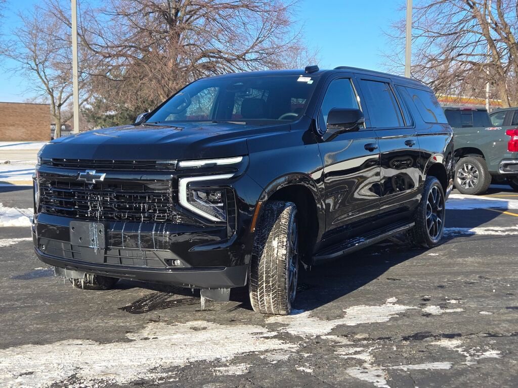 Advanced Trailering Package, AM/FM radio: SiriusXM with 360L, Apple CarPlay/Android Auto, Auto High-beam Headlights, Blind Zone Steering Assist with Trailering, Bose 10-Speaker Surround with CenterPoint, Comfort Package, Exterior Parking Camera Rear, Extra Capacity Cooling System, Front dual zone A/C, Front fog lights, Fully automatic headlights, Garage door transmitter, Heated 2nd Row Outboard Seats, Heated Driver and Front Passenger Seats, Heated Steering Wheel, Hill Descent Control, Hitch View with Pan/Zoom Image Adjustment, Integrated Trailer Brake Controller, Max Trailering Package, Memory seat, Memory Settings, Memory Settings For Driver, Navigation system: Google built-in compatibility (select service plan required, terms and limitations apply), Panic alarm, Power Release 2nd Row Bucket Seats, Preferred Equipment Group 1SP, Radio: 17.7 Diagonal Advanced Color LCD Display, Rain sensing wipers, Rear Power Liftgate, Remote keyless entry, RST Exterior Features, Security system, Smart Trailer Integration Indicator, Steering wheel mounted audio controls, Universal Home Remote, Wheels: 22 x 9 Bright Machined, Wireless Apple CarPlay/Wireless Android Auto, Wireless Phone Charging. Recent Arrival! Clean CARFAX. Black 2025 Chevrolet Suburban 4D Sport Utility RST EcoTec3 5.3L V8 14/19 City/Highway MPG 10-Speed Automatic with Overdrive 4WD. We buy ALL vehicles! Ask for our Customer Care team 847-584-1013.
