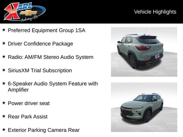 Recent Arrival! Carfax One Owner, Local Trade & Sold New at Karls! Clean Carfax. Certified. Cacti Green 2025 Chevrolet TrailBlazer Activ 4DR AWD Activ 1.3L Ecotec Turbo DOHC SIDI w/VVT 1 Type-A and 1 Type-C USB Ports, 6-Speaker Audio System Feature with Amplifier, Auto High-beam Headlights, Driver Confidence Package, Exterior Parking Camera Rear, Heated Driver and Front Passenger Seats, Heated steering wheel, Lane Change Alert with Side Blind Zone Alert, Power driver seat, Preferred Equipment Group 1SA, Radio: AM/FM Stereo Audio System, Rear Cross Traffic Alert, Rear Park Assist, SiriusXM Trial Subscription, Summit White Two-Tone Roof, Wheels: 17 High Gloss Black Machined Aluminum, Wireless Apple CarPlay/Android Auto. 26/29 City/Highway MPG 9-Speed Automatic AWD. At Karl Chevrolet we want to help you find the best new or used car in Ankeny that suits your needs. Check out the 2025 Chevrolet TrailBlazer For Sale in Ankeny, IA. When you buy a new car at Karl Chevrolet you know you're finding a vehicle you can rely on. We have a great selection of Platinum Quality Pre-Owned Vehicles. We also pride ourselves in creating a friendly atmosphere and reliable new car dealership that you can trust. Call us with any questions about our 2025 Chevrolet TrailBlazer and our experts will be glad to help you!