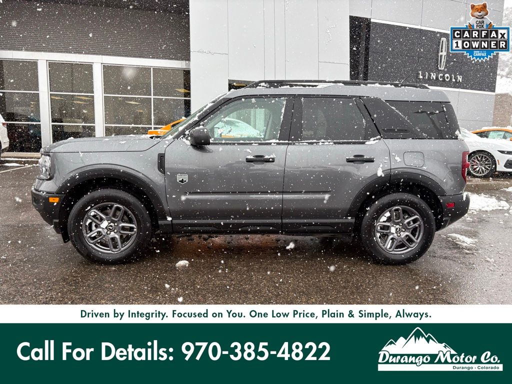 Certified! This 2025 Ford Bronco Sport Big Bend 4x4 blends everyday comfort with real off-road capability. Powered by a 1.5L EcoBoost engine and an 8-speed automatic transmission, it delivers impressive efficiency at 27 MPG combined while still offering confident traction with 4x4 and the Terrain Management System. Finished in Carbonized Gray Metallic with a durable Smoked Truffle interior, its a versatile SUV built for Colorado roads, trails, and everything in between. At Durango Motor Company in Durango, Colorado, our non-commissioned sales team is here to help you find the right vehicle at the right price. If youd like more details, extra photos, or a personalized walk-around video, our team is happy to help. Recent Arrival! Odometer is 5199 miles below market average! 25/30 City/Highway MPG Ford Gold Certified Details: Roadside Assistance, Transferable Warranty, Powertrain Limited Warranty, Vehicle History, Limited Warranty, Vehicle History. Durango Lincoln is dedicated to your satisfaction before, during, and after your purchase. We'll go the extra mile to take care of you.