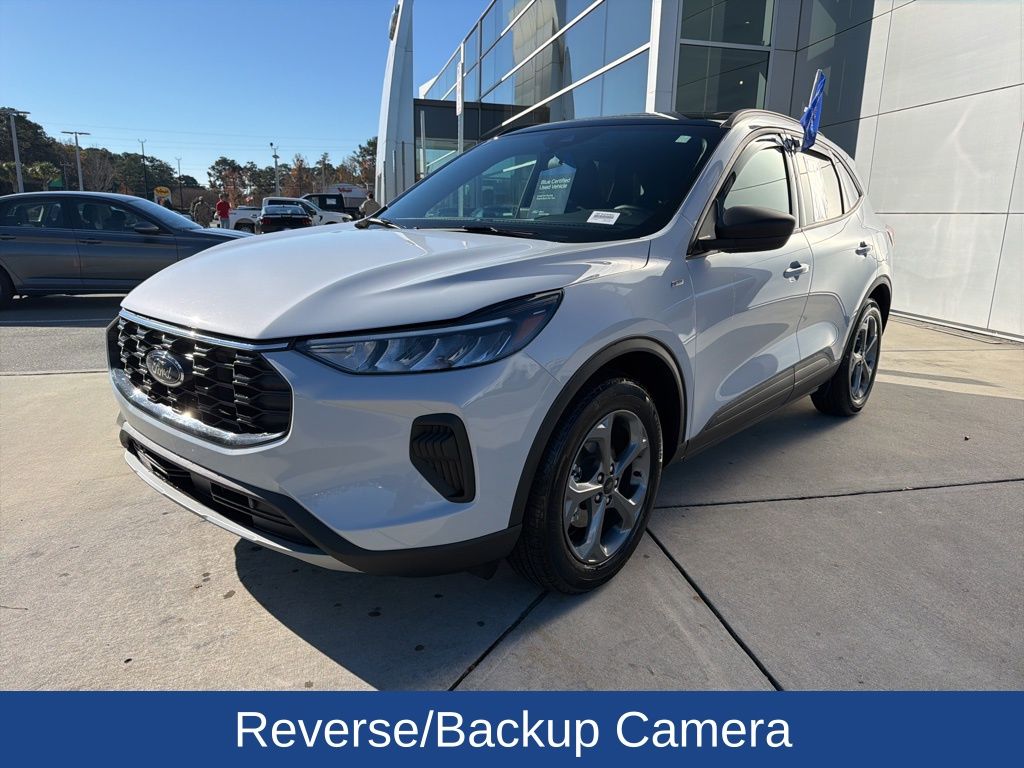 Sporty styling meets impressive efficiency in this 2025 Ford Escape Hybrid ST-Line with VIN 1FMCU0MZ9SUB29338 and 13,213 miles. Designed to stand out while delivering everyday practicality, this Escape Hybrid blends athletic design cues with advanced technology and comfort-focused features. This example is upgraded with factory-added power liftgate and a panoramic Vista Roof, bringing added convenience and an open, airy feel to the cabin. The Cold Weather Package enhances year-round comfort with a heated steering wheel, heated power exterior mirrors, heated vinyl and cloth front seats, and remote start, making cold mornings far more comfortable. Technology is a major highlight thanks to Tech Package #1, which adds adaptive cruise control with lane centering, evasive steering assist, built-in navigation, reverse parking sensors, and a large 13.2-inch touchscreen that anchors the modern interior. These advanced driver-assist features help reduce fatigue and increase confidence in a variety of driving conditions. With its low mileage, hybrid efficiency, upscale factory options, and ST-Line sport-inspired design, this 2025 Escape Hybrid delivers a refined, tech-forward driving experience that’s ready for daily commuting and weekend getaways alike.