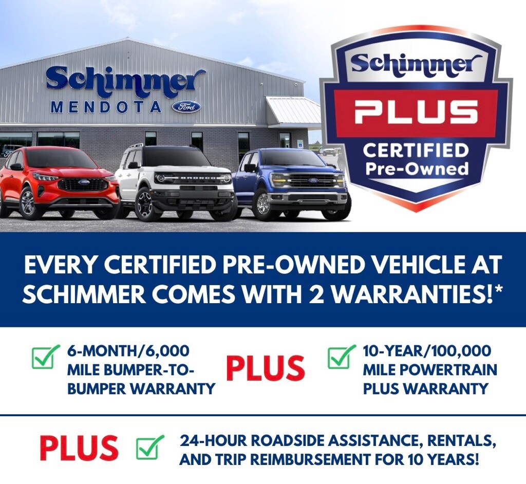 Schimmer Plus Certified Program: Bumper-to-Bumper Warranty for 6 months, Powertrain Warranty for 10 years from original in-service date, 24 hour roadside assistance, rental and trip reimbursement for 10 years from original in-service date. Contact Mendota Ford at 815-539-9314 and ask for one of our friendly and knowledgeable sales staff for more information. This vehicle and more like it can be viewed on our website www.mendotaford.com. If you don't see what you are looking for in stock let us know and we will find the right vehicle for you. Stop by and see why our customers love our store. Mendota Ford is a community dealership that is here for you.