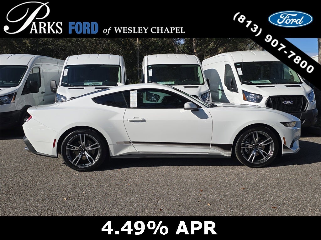 This Ford Gold Advantage Gold Certified 2025 Ford Mustang EcoBoost Coupe delivers iconic Mustang performance, modern technology and unmistakable design in a nearly new sports car that is built to excite every time you press the start button. With just 6,864 miles, this Mustang is barely broken in and offers an exceptional opportunity to own a current-generation performance coupe with Gold Certified protection and long-term peace of mind for drivers throughout Wesley Chapel, Tampa, Brandon, Clearwater, and the greater Tampa Bay area. Finished in Oxford White with a Black Onyx cloth interior, this Mustang presents a clean, aggressive look that perfectly showcases the S650 generation’s bold redesign. Power comes from Ford’s advanced 2.3L EcoBoost turbocharged engine paired with a responsive 10-speed automatic transmission. Selectable drive modes allow you to tailor steering feel, throttle response, and stability control to match your driving style, while the independent rear suspension provides confident handling and a planted, composed ride. The cockpit is driver-focused and modern. A fully digital 12.4-inch instrument cluster pairs with a massive 13.2-inch center touchscreen running SYNC 4, creating a seamless, high-tech driving environment. Dual-zone automatic climate control, a flat-bottom steering wheel, push-button start, intelligent access, and smart USB charging ports all contribute to a refined yet performance-oriented interior. The split-fold rear seat adds practicality, making this Mustang more versatile than many traditional sports cars.
