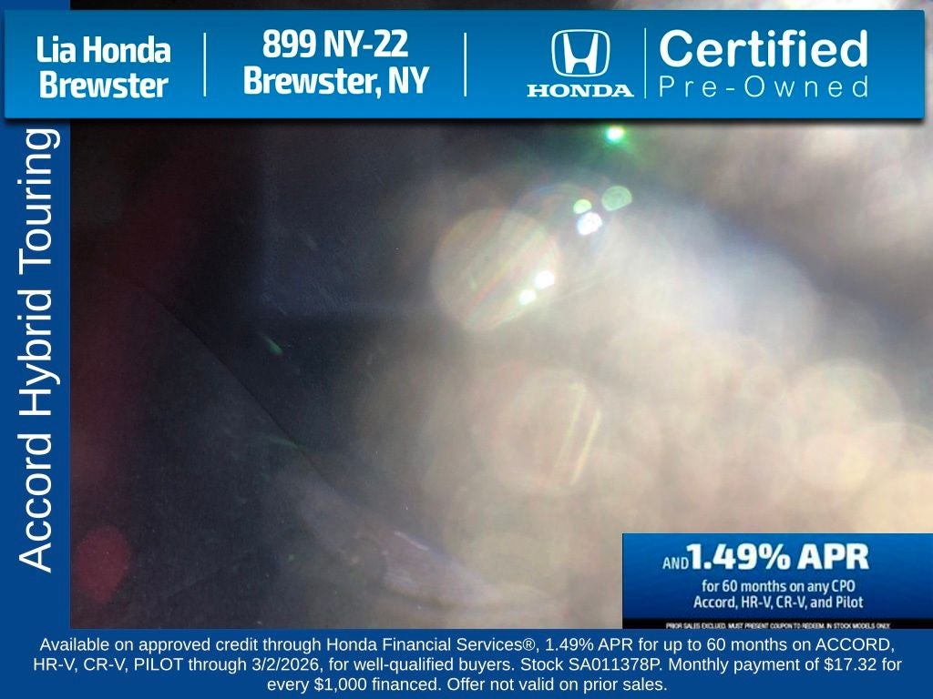 Recent Arrival! Honda Certified *. Blue 2025 Honda Accord Hybrid Touring 2.0L I4 DOHC 16V eCVT FWD 46/41 City/Highway MPG. HondaTrue Certified Details: Warranty Deductible: $0, 182 Point Inspection, Powertrain Limited Warranty: 84 Month/100,000 Mile (whichever comes first) from original in-service date, Roadside Assistance, Vehicle History, Transferable Warranty, Vehicles purchased within New Vehicle Limited Warranty period: extends New Vehicle Limited Warranty to 5 years/60,000 miles. Honda Care Roadside Assistance for 2 year/100,000 miles (whichever occurs first). Up to two complimentary oil changes within the first year of ownership. SiriusXM 90-Day Trial. Limited Warranty: 24 Month/100,000 Mile (whichever comes first) after new car warranty expires or from certified purchase date. Come into Brewster Honda and see how our Value pricing saves you time and money.
