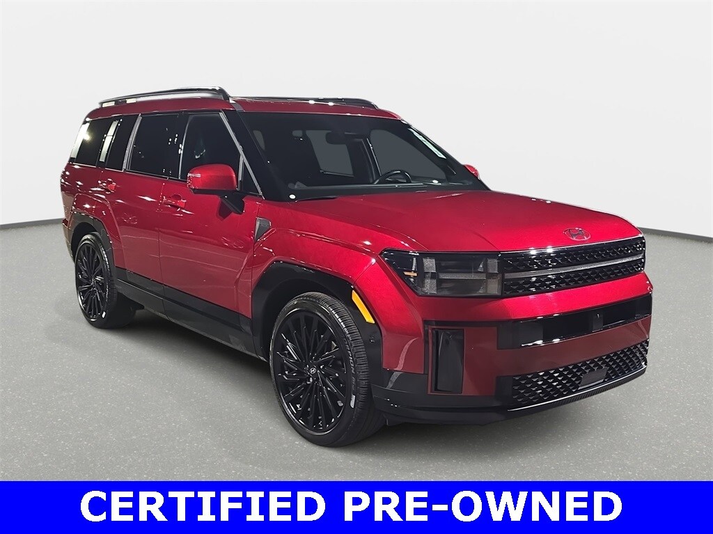 Recent Arrival! 2025 Hyundai Santa Fe Calligraphy AWD Ultimate Red AWD Shiftronic 2.5L I4 *INCLUDES WARRANTY*, Santa Fe Calligraphy AWD, 4D Sport Utility, 2.5L I4, Shiftronic, AWD, Ultimate Red, Black w/Leather Seat Trim, 3rd row seats: bench, Heated & Ventilated Front Bucket Seats, Heated front seats, Heated rear seats, Navigation System, Option Group 01. 20/28 City/Highway MPG Odometer is 3367 miles below market average! Hyundai Certified Used Vehicles Details: Warranty Deductible: $50, 173+ Point Inspection, Powertrain Limited Warranty: 120 Month/100,000 Mile (whichever comes first) from original in-service date, Roadside Assistance, Includes 10-year/Unlimited Mileage Roadside Assistance with Rental Car and Trip Interruption Reimbursement; Please See Dealers for Specific Vehicle Eligibility Requirements. 10-Year/100,000 Mile Hybrid/EV Battery Warranty. 3-Months SiriusXM Trial Subscription. Complimentary 1 Year (Connected Care & Remote Pkgs). Limited Warranty: 60 Month/60,000 Mile (whichever comes first) from original in-service date. Vehicle History. Price excludes dealer options, plus tax, tag, any aftermarket addendums, and $899 admin fee. It does not include any taxes, fees, or other charges. Pricing provided may vary significantly between website and dealer as a result of supply chain constraints. Contact your dealer for updated vehicle pricing. See dealer for qualifications and complete details. Images, prices, and options shown, including vehicle color, trim, options, pricing, and other specifications are subject to availability, incentive offerings, current pricing, and credit worthiness.