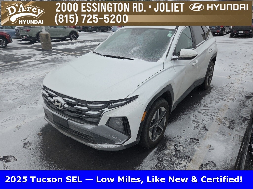 Clean CARFAX. One owner local trade!, Low miles!, Great vehicle history!, Remaining full factory warranty!, Bought here serviced here!, Hyundai certified!, Fully serviced and ready to go!. Certified. Recent Arrival! White Pearl 2025 Hyundai Tucson SEL AWD 8-Speed Automatic with SHIFTRONIC 2.5L I4 DGI DOHC 16V LEV3-SULEV30 187hp. Hyundai Certified Used Vehicles Details: Warranty Deductible: $50, Limited Warranty: 60 Month/60,000 Mile (whichever comes first) from original in-service date, 173+ Point Inspection, Powertrain Limited Warranty: 120 Month/100,000 Mile (whichever comes first) from original in-service date, Includes 10-year/Unlimited Mileage Roadside Assistance with Rental Car and Trip Interruption Reimbursement; Please See Dealers for Specific Vehicle Eligibility Requirements. 10-Year/100,000 Mile Hybrid/EV Battery Warranty. 3-Months SiriusXM Trial Subscription. Complimentary 1 Year (Connected Care & Remote Pkgs). Roadside Assistance. Vehicle History. Discover the D'Arcy Difference! We care - we are here and we are ready to help! Stop by www.darcyhyundai.com today to see up to date information, including showroom and service hours, and how to make an appointment or schedule delivery. D'Arcy Motors has been serving Joliet and its surrounding communities for over 25 years. Our business philosophy, which is to sell cars one car at a time and to make the guest the most important part of the process, has remained the same since 1991. Contact us today to experience the D'Arcy Difference! Pulse Safer Braking Technology for $399 added to all New and CPO vehicles - The rear-end collision deterrent that rapidly pulses your third brake light four times before it goes solid when you press the brake pedal.