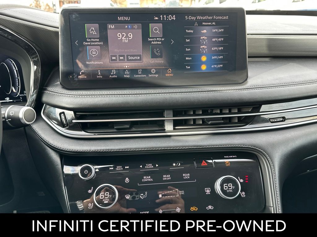 This 2025 INFINITI QX60 LUXE in Graphite Shadow comes with the following features: 2.0L I4 Turbocharged DOHC 16V LEV3-ULEV50 268hp 9-Speed Automatic FWD. This vehicle is a factory certified pre-owned and features a luxury interior with heated and cooled front leather seats, heated rear leather seats, keyless entry, moonroof, navigation, panoramic moonroof, power windows, locks and mirrors, premium audio, premium wheels, push button start, rear view back-up camera, remote start, and a head-up display. The QX60 is known for its spacious and comfortable interior with seating for up to eight, making it a great choice for families or those who need extra space. INFINITI of Birmingham offers a wide selection of new and used vehicles, including luxury SUVs and sedans.