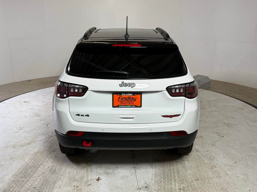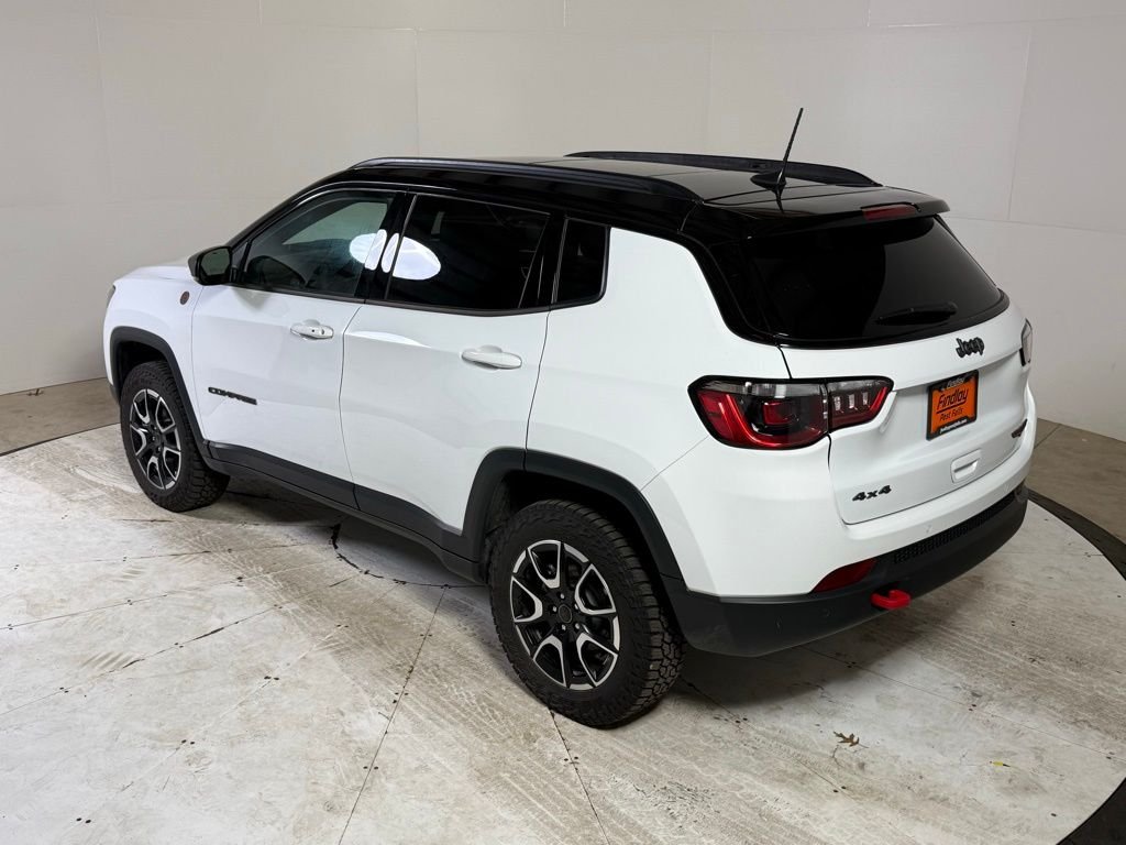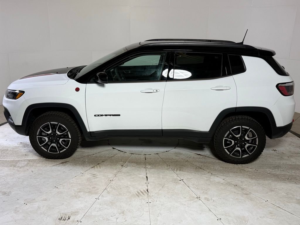 Priced below KBB Fair Purchase Price! Clean CARFAX. Bright White Clearcoat 2025 Jeep Compass Trailhawk 4D Sport Utility 4WD 8-Speed Automatic 2.0L I4 DOHC 24/32 City/Highway MPG. This Jeep Compass is equipped with the following features: Quick Order Package 29E, Trailhawk Convenience Group, 10.1" Touchscreen Display, 4-Wheel Disc Brakes, 6 Speakers, ABS brakes, Air Conditioning, Alloy wheels, AM/FM radio: SiriusXM, Apple CarPlay/Android Auto, Auto High-beam Headlights, Auto-dimming Rear-View mirror, Automatic temperature control, Brake assist, Bumpers: body-color, Compass, Delay-off headlights, Driver door bin, Driver vanity mirror, Dual front impact airbags, Dual front side impact airbags, Electronic Stability Control, Emergency communication system: Jeep Connect, Four wheel independent suspension, Front anti-roll bar, Front Bucket Seats, Front Center Armrest w/Storage, Front dual zone A/C, Front fog lights, Front License Plate Bracket, Front reading lights, Fully automatic headlights, Heated door mirrors, Illuminated entry, Knee airbag, Leather Shift Knob, Leather steering wheel, Low tire pressure warning, Occupant sensing airbag, Outside temperature display, Overhead airbag, Overhead console, Panic alarm, ParkView Rear Back-Up Camera, Passenger door bin, Passenger vanity mirror, Power door mirrors, Power Front/Fixed Rear Full Sunroof, Power steering, Power windows, Premium Alpine Speaker System, Premium audio system: UConnect 5, Premium Cloth/Leather Trim Bucket Seats, Radio: Uconnect 5 w/10.1" Display, Rain sensing wipers, Rear anti-roll bar, Rear seat center armrest, Rear window defroster, Rear window wiper, Remote keyless entry, Security system, Speed control, Split folding rear seat, Spoiler, Steering wheel mounted audio controls, Tachometer, Telescoping steering wheel, Tilt steering wheel, Traction control, Trip computer, Turn signal indicator mirrors, Variably intermittent wipers.