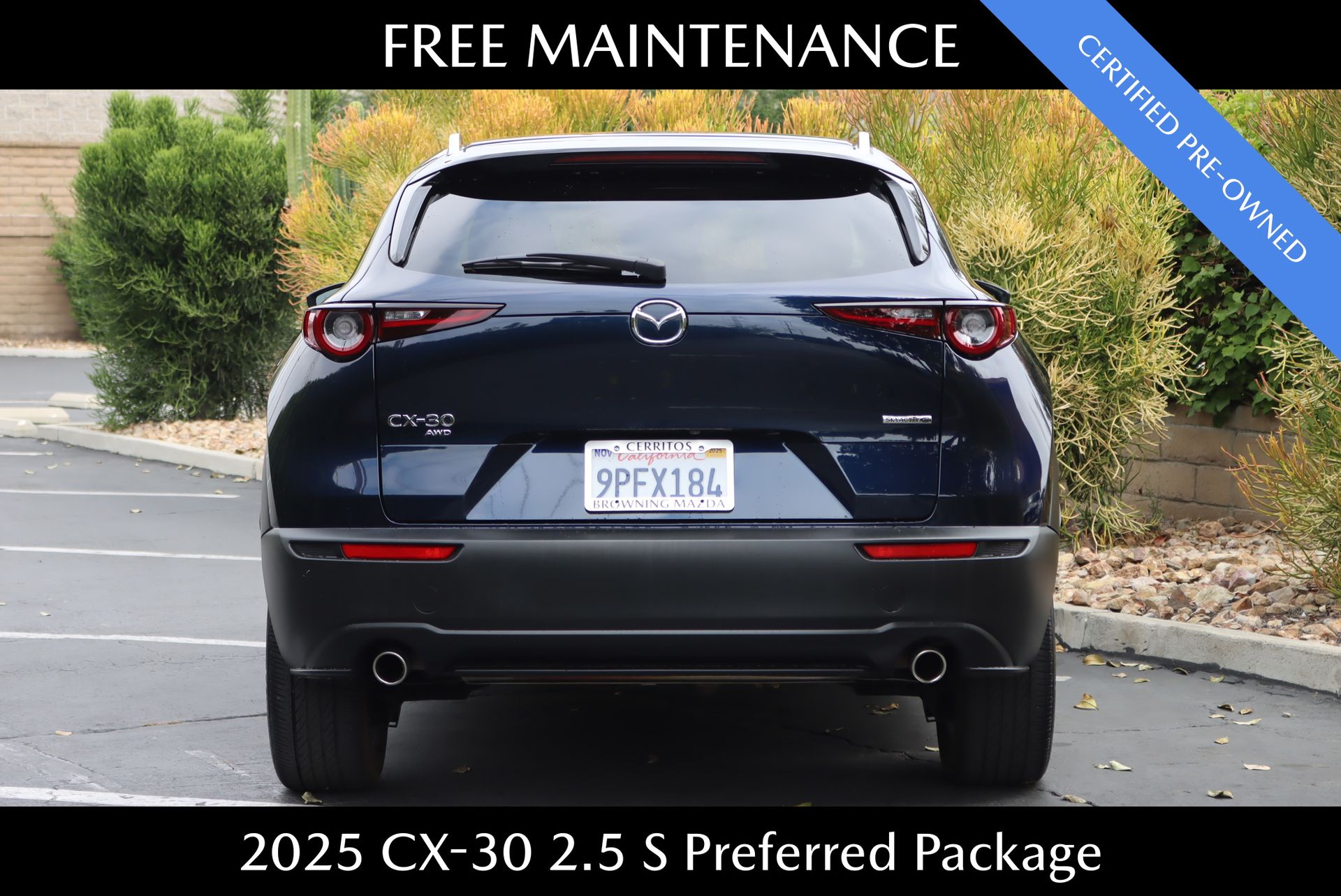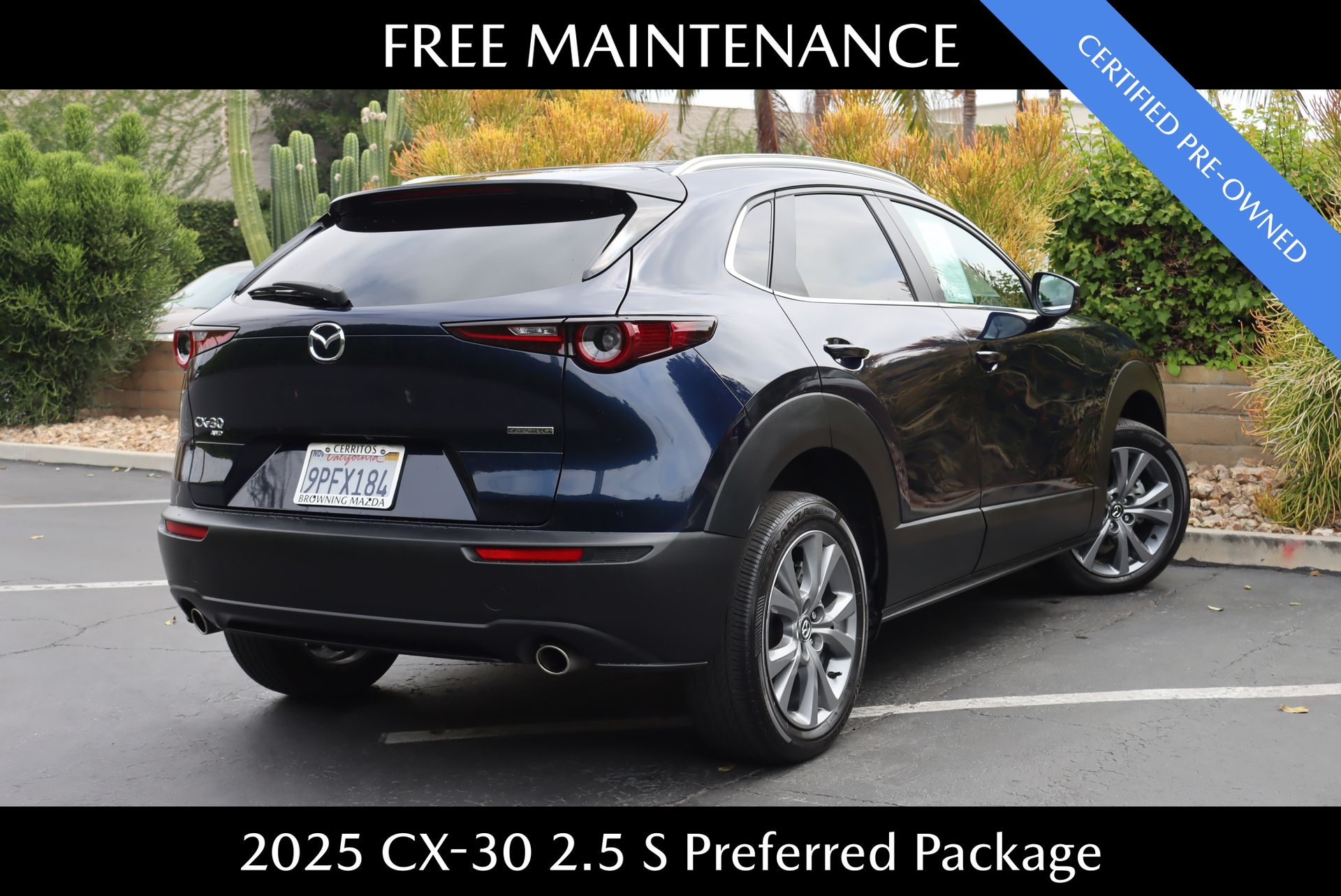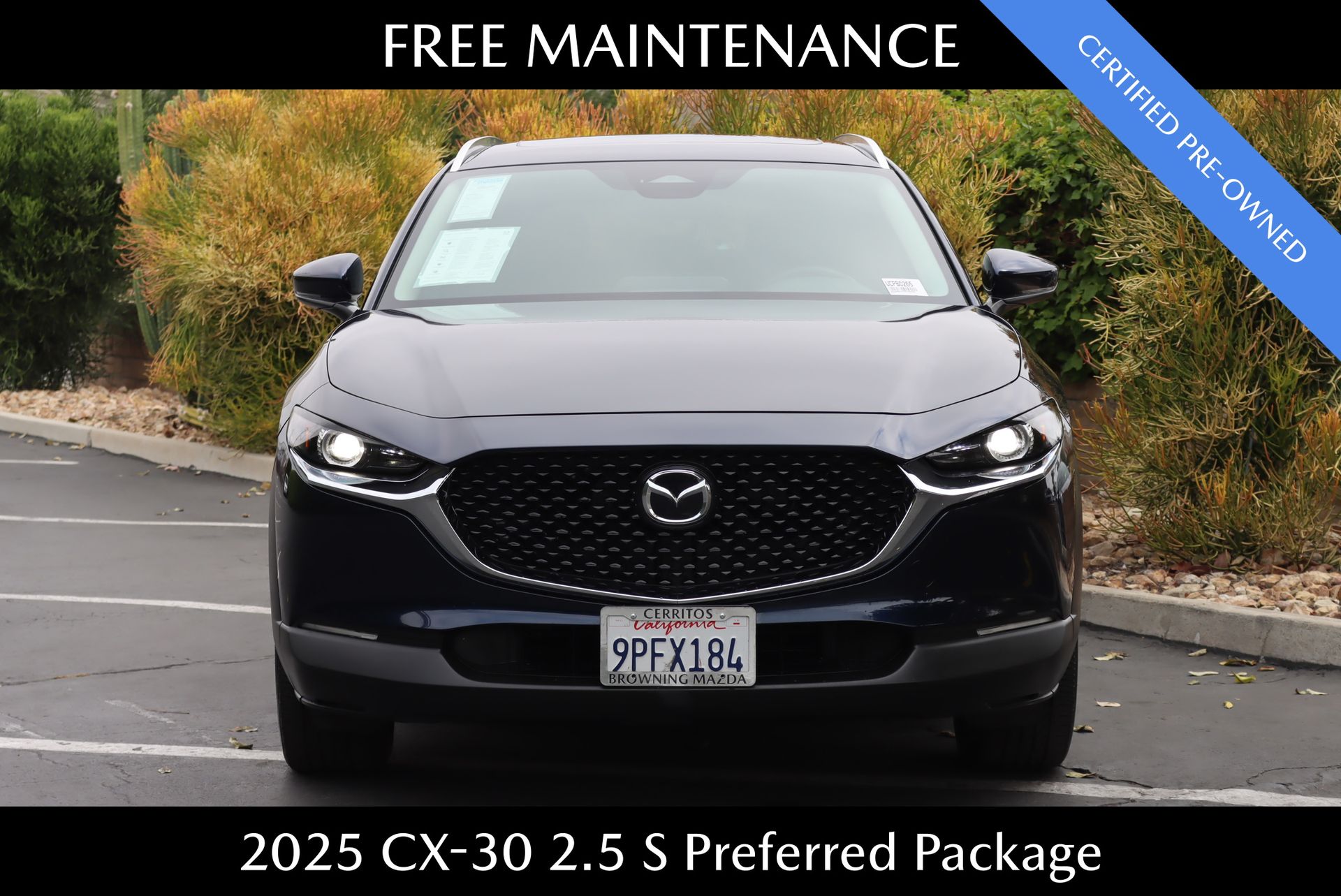CARFAX One-Owner. Clean CARFAX. Certified. Deep Crystal Blue Mica 2025 Mazda CX-30 2.5 S Preferred Package AWD 6-Speed Automatic SKYACTIV® 2.5L 4-Cylinder DOHC 16V. 26/33 City/Highway MPG. Mazda Certified Pre-Owned Details: Warranty Deductible: $0. Powertrain Limited Warranty: 84 Month/100,000 Mile (whichever comes first) from original in-service date. Vehicle History. Includes Autocheck Vehicle History Report with 3 Year Buyback Protection. 3 month SiriusXM trial subscription. Limited Warranty: 12 Month/12,000 Mile (whichever comes first) after new car warranty expires or from certified purchase date. Transferable Warranty. 160 Point Inspection. Roadside Assistance.