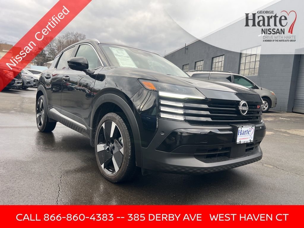 2025 Nissan Kicks SR AWD for Sale Near New Haven, CT. Sporty SR Trim • All-Wheel Drive • Certified Compact SUV in Fairfield County. Finished in sleek Super Black, this Kicks SR makes a bold impression with its athletic stance, 19-inch alloy wheels, and sporty design cues exclusive to the SR trim. With just 6,794 miles, a clean CARFAX, and Harte Certified Plus coverage, this Nissan Kicks offers near-new condition with exceptional long-term value. Under the hood, the responsive 2.0L DOHC engine pairs seamlessly with a CVT with Xtronic, delivering smooth acceleration, confident handling, and excellent fuel efficiency rated at 27 MPG city / 34 MPG highway. The addition of all-wheel drive makes this Kicks an ideal choice for navigating Connecticut winters, wet roads, and year-round commuting through New Haven County and Fairfield County. Inside, the cabin blends sport-inspired design with everyday comfort. Enjoy Sport Cloth and Leatherette seating, wireless Apple CarPlay and Android Auto, steering wheelmounted controls, and a versatile split-folding rear seat for added cargo flexibility. Advanced safety and stability systems provide added confidence for daily driving.