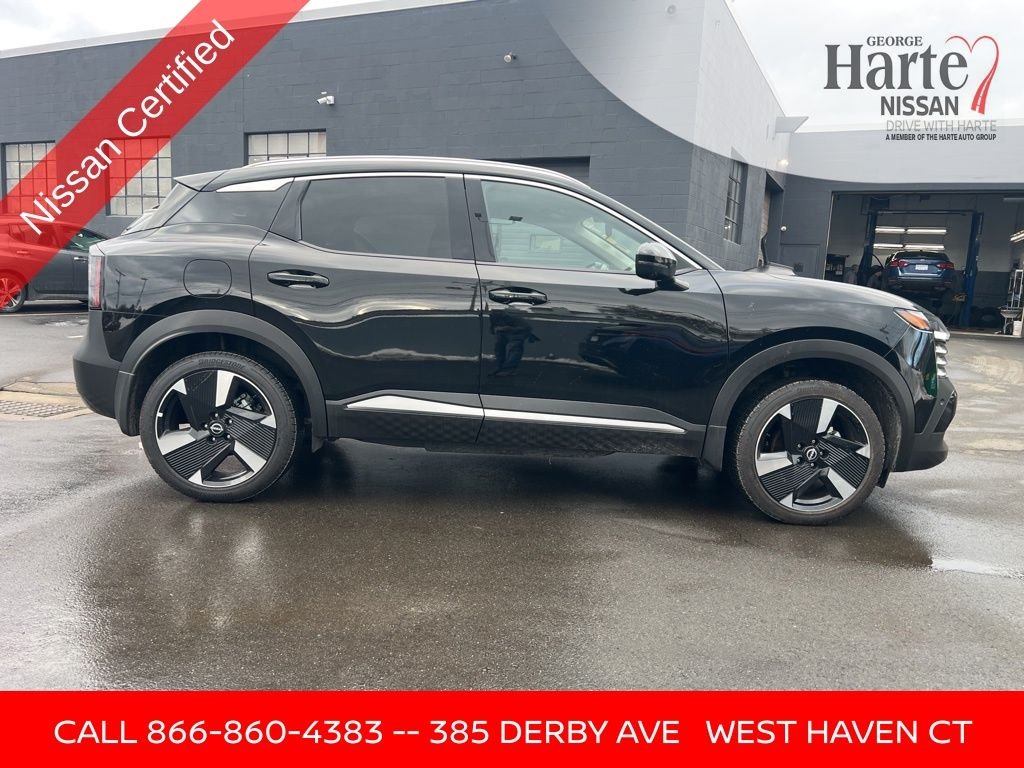 2025 Nissan Kicks SR AWD for Sale Near New Haven, CT. Sporty SR Trim • All-Wheel Drive • Certified Compact SUV in Fairfield County. If you're searching for a used 2025 Nissan Kicks SR AWD near New Haven, Milford, or anywhere in Fairfield County, this low-mileage, one-owner Kicks delivers standout style, modern technology, and confident all-wheel-drive capability in a compact, city-friendly package. Finished in sleek Super Black, this Kicks offers near-new condition with just 6,794 miles. With just 6,794 miles, a clean title and Harte Certified only, this Nissan Kicks is an ideal choice for navigating Connecticut winters, wet roads, and year-round commuting through New Haven County and Fairfield County. The cabin blends sport-inspired design with everyday comfort. Enjoy Sport Cloth and Leatherette seating surfaces, wireless Apple CarPlay and Android Auto, steering wheelmounted controls, and a versatile split-folding rear seat for added cargo flexibility. Advanced safety and stability systems provide added confidence for daily driving.