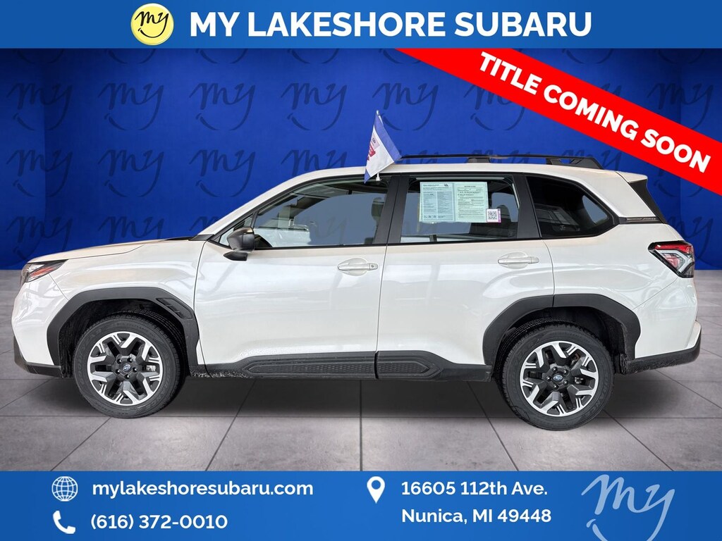 Crystal White Pearl, All wheel drive, Apple CarPlay & Android Auto, Backup camera, EyeSight Driver Assist, Lane departure warning, Oil changes for life. Certified. Crystal White Pearl 2025 Subaru Forester AWD Lineartronic CVT 2.5L 4-Cylinder DOHC 16V. My Lakeshore Subaru is your #1 choice in Michigan to get the best price on used vehicles and best value for your trade. The My Lakeshore Subaru team is ready to provide you with a world-class experience, ensuring that you find the perfect vehicle that fits all your needs. Every vehicle has been through a full safety inspection completed by certified technicians and fully detailed. We sell many makes and models, Certified Pre-owned Subarus and Pre-owned Vehicles with years from 2025-2024-2023-2022-2021-2020-2019-2018-2017-2016-2015-2014-2013-2012-2011-2010-2009-2008-2007 and all makes Audi, BMW, Chevrolet, Toyota, Volkswagen, Kia, Hyundai, Mazda, Mercedes, Dodge, Chrysler, Jeep, Ram, Lincoln, Honda, Subaru, and many models like Crosstrek, Outback, Forester and more. Take advantage of our VIP experience by calling us at 231-1234 or stop by our location at 16600 W. Grand Ave. Nunica MI 49448.