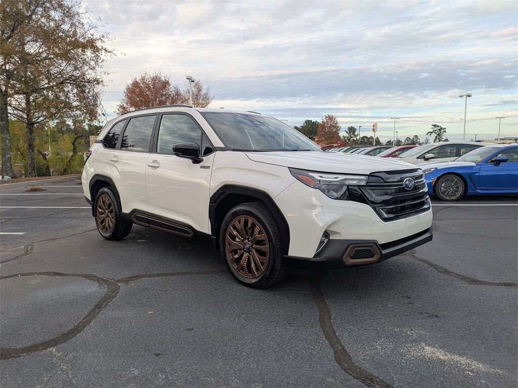 Recent Arrival! 2025 Subaru Forester Hybrid Sport Certified Pre-Owned, Clean Carfax, no accidents, one owner, Forester Hybrid Sport, Crystal White Pearl, Gray Premium Synthetic, 11 Speakers, Air Conditioning, All-Weather Floor Liners, AM/FM radio: SiriusXM with 360L, Anti-whiplash front head restraints, Auto High-beam Headlights, Auto-Dimming Exterior Mirror with Approach Light, Auto-Dimming Mirror with Compass and HomeLink, Automatic temperature control, Brake assist, Cargo Tray, Compass, Driver door bin, Driver vanity mirror, Dual front impact airbags, Dual front side impact airbags, Electronic Stability Control, Emergency communication system: MySubaru Safety (3-year free trial), Front anti-roll bar, Front Bucket Seats, Front Center Armrest, Front dual zone A/C, Front fog lights, Front reading lights, Fully automatic headlights, harman/kardon Speakers, Heated door mirrors, Heated Front Bucket Seats, Heated front seats, Illuminated entry, Knee airbag, LED Upgrade, Low tire pressure warning, Navigation system: TomTom Navigation w/what3words, Occupant sensing airbag, Outside temperature display, Overhead airbag, Overhead console, Passenger door bin, Passenger vanity mirror, Power driver seat, Power Liftgate, Power moonroof: Panoramic, Power steering, Power windows, Protection Package Protection Standard Model.