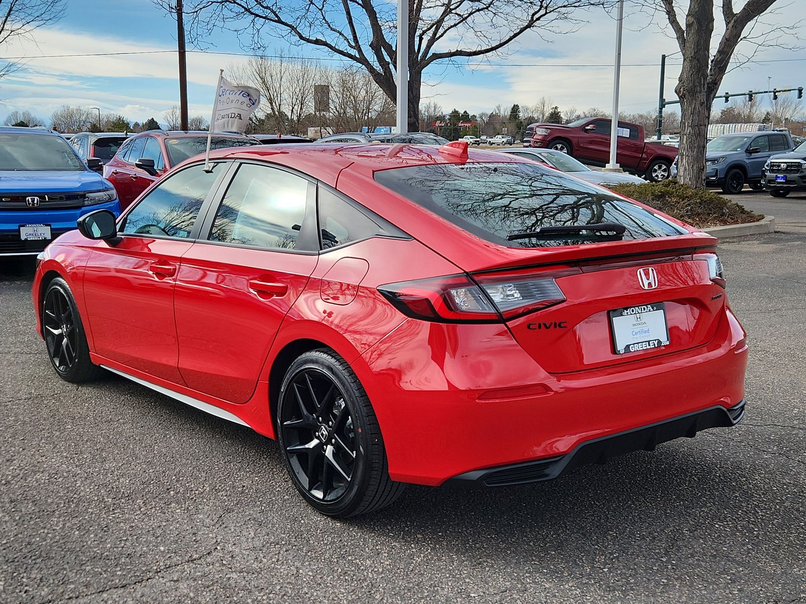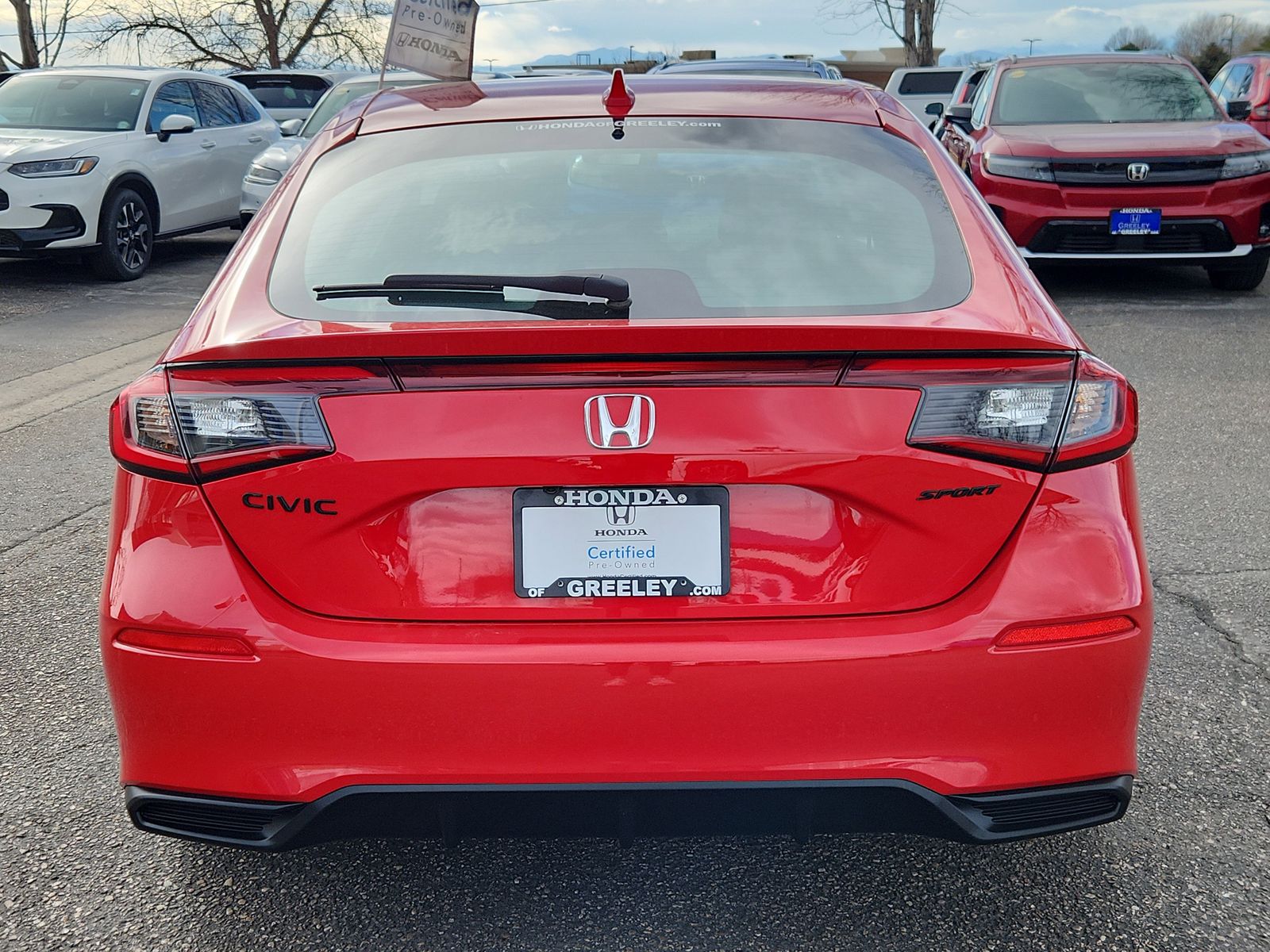 It’s so easy at Honda of Greeley! 2026 Honda Civic Sport Rallye Red Sport FWD 2.0L I4 DOHC 16V CVT. HondaTrue Certified Certified, Black Artificial Leather, 4-Wheel Disc Brakes, 8 Speakers, ABS brakes, Adaptive Cruise Control: Adaptive Cruise Control (ACC) with Low-Speed Follow, Air Conditioning, Alloy wheels, AM/FM radio, Apple CarPlay/Android Auto, Auto High-beam Headlights, Automatic temperature control, Blind Spot Information (BSI) System warning, Brake assist, Bumpers: body-color, Cloth/Leatherette Seating Surfaces, Delay-off headlights, Driver door bin, Driver vanity mirror, Dual front impact airbags, Dual front side impact airbags, Electronic Stability Control, Emergency communication system: HondaLink, Exterior Parking Camera Rear, Four wheel independent suspension, Front anti-roll bar, Front Bucket Seats, Front Center Armrest, Front reading lights, Fully automatic headlights, Heated door mirrors, HondaLink, Illuminated entry, Knee airbag, Lane departure: Lane Keeping Assist System (LKAS) active, Leather Shift Knob, Low tire pressure warning, Occupant sensing airbag, Outside temperature display, Overhead airbag, Panic alarm, Passenger door bin, Passenger vanity mirror, Power door mirrors, Power steering, Power windows, Radio data system, Radio: 180-Watt Audio System, Rear anti-roll bar, Rear side impact airbag, Rear window defroster, Rear window wiper, Remote keyless entry, Security system, Speed control, Speed-sensing steering, Split folding rear seat, Steering wheel mounted audio controls, Tachometer, Telescoping steering wheel, Tilt steering wheel, Traction control, Trip computer, Wheels: 18" Gloss Black Alloy, Black Artificial Leather. 30/38 City/Highway MPG Certified. All used car prices include dealer and handling charge of $798. Come to www.HondaofGreeley.com To See Our Specials!!! Call us at 970-506-2791 For help with anything we offer.