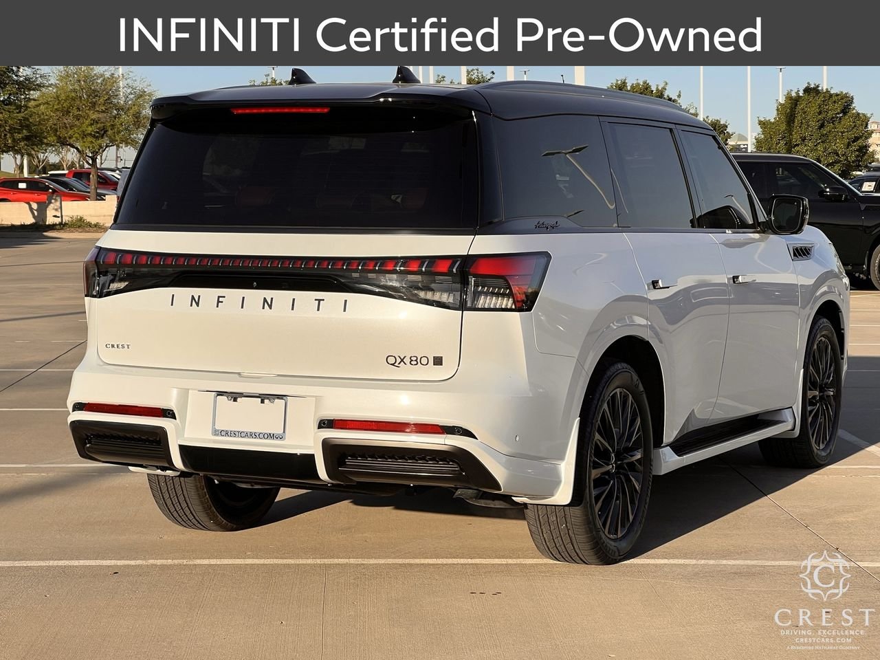 Certified. INFINITI Details: * Eligible on Non-INFINITI Vehicles Up to 10 Years Old From New Warranty Start Date and Fewer than 100,000 Miles. 1 Prepaid Service Visit Included Within the First Year of Ownership (excludes EVs). 6 Months/6,000 Mile Limited Powertrain Warranty, $100 Deductible, 84 Point Inspection, Roadside Assistance, Select Makes/Models. 2026 INFINITI QX80 Autograph Thank you for viewing our vehicle. You can see more Premium Pre-Owned vehicles like this one at CrestCars.com. Crest Automotive Group proudly serving the following communities: Plano, Mckinney, Allen, Richardson, Dallas, Ft. Worth, Grapevine, Bedford, Hurst, Mesquite, Frisco, Lewisville, Little Elm, Arlington, Coppell, Grand Prarie, Euless, Colleyville, Wylie, Lavon, Prosper, Denton, Murphey, Anna, Celina, Sherman, Southlake, Flowermound, DFW, Addison, Irving, Las Colinas, Garland, Aubrey, Oak Point, Corinth, University Park, Highland Park, Carrolton, Richardson, Melissa, Azle, Lake Dallas, Krum, Roanoke, Keller, Trophy Club, Farmers Branch. Haslet, Bedfprd. Euless, Hurst, North Richland Hills, Saginaw, Justin, Benbroook, White Settlement, Hudson Oaks, Weatherford, Crowley, Watauga, Cedar Hill, Desoto, Duncanville, Midlothian, Waxahachie, Mansfield, Red Oak, Lancaster, Ennis, Palmer, Balch Springs, Mesquite, Cleburne, Alvarado, Seagoville, Combine, Terrell, Rockwall, Sachase, Allen, The Colony, Pilot Point, Gainsville, Whitesboro, North Texas, Durant, Ardmore, Bridgeport, Decatur, Paris.