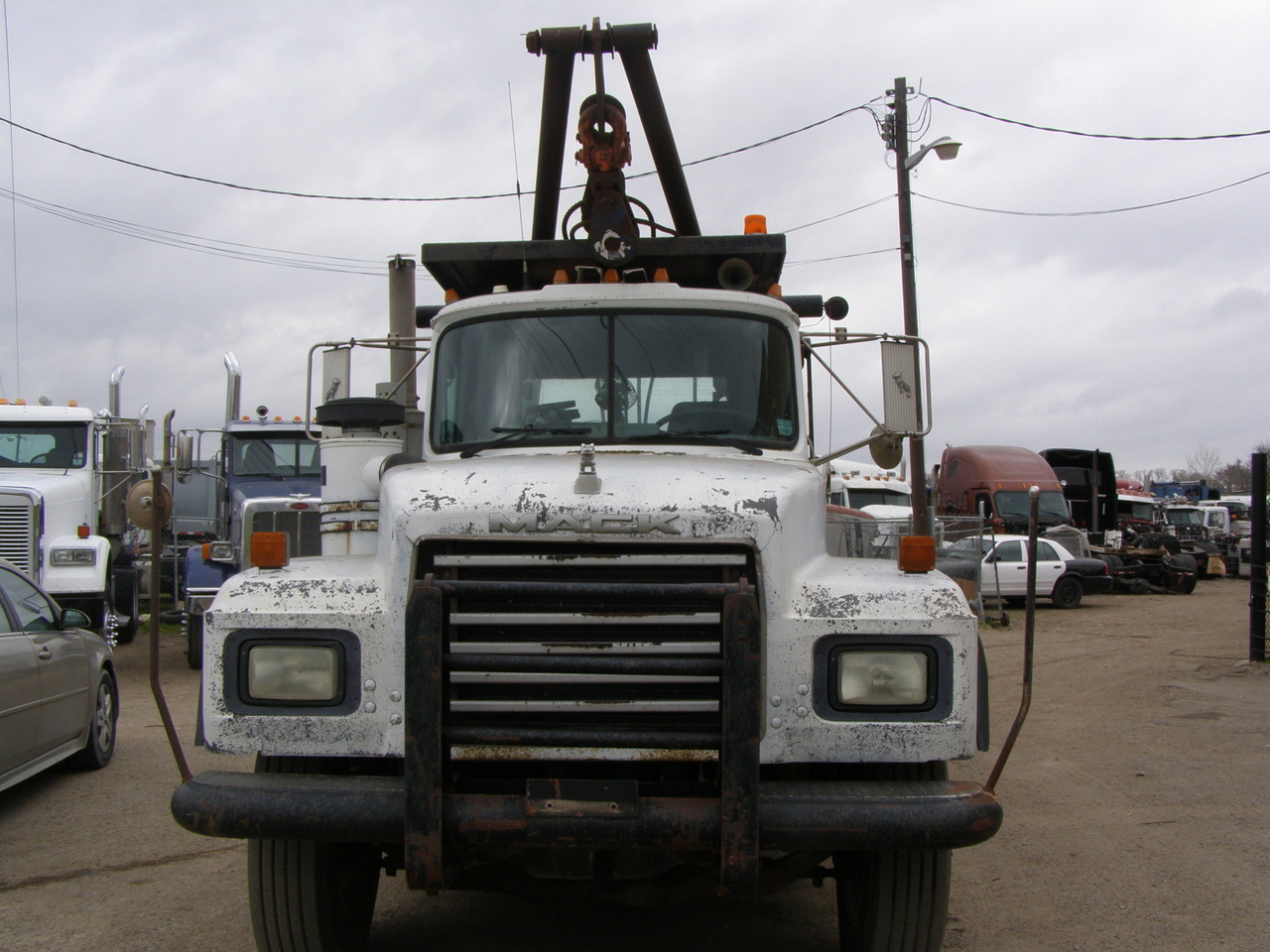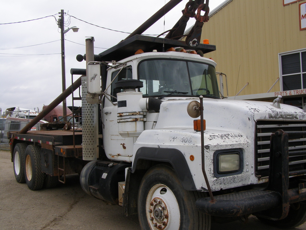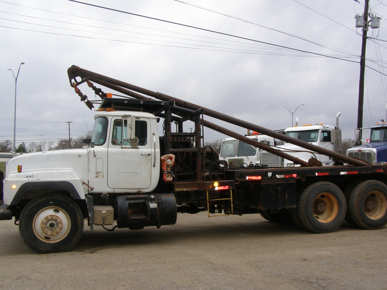 1994 Mack RD 688S E7-350, 10 spd with 1241 aux. and power tower, 12 front axle, 40 rears on camelback, two winches, poles, full tail roller, rear mount fifthwheel, snatch blocks, 240" WB, P/S, A/C, 17'6" bed, 11X24.5 tires. DALLAS, TX.
