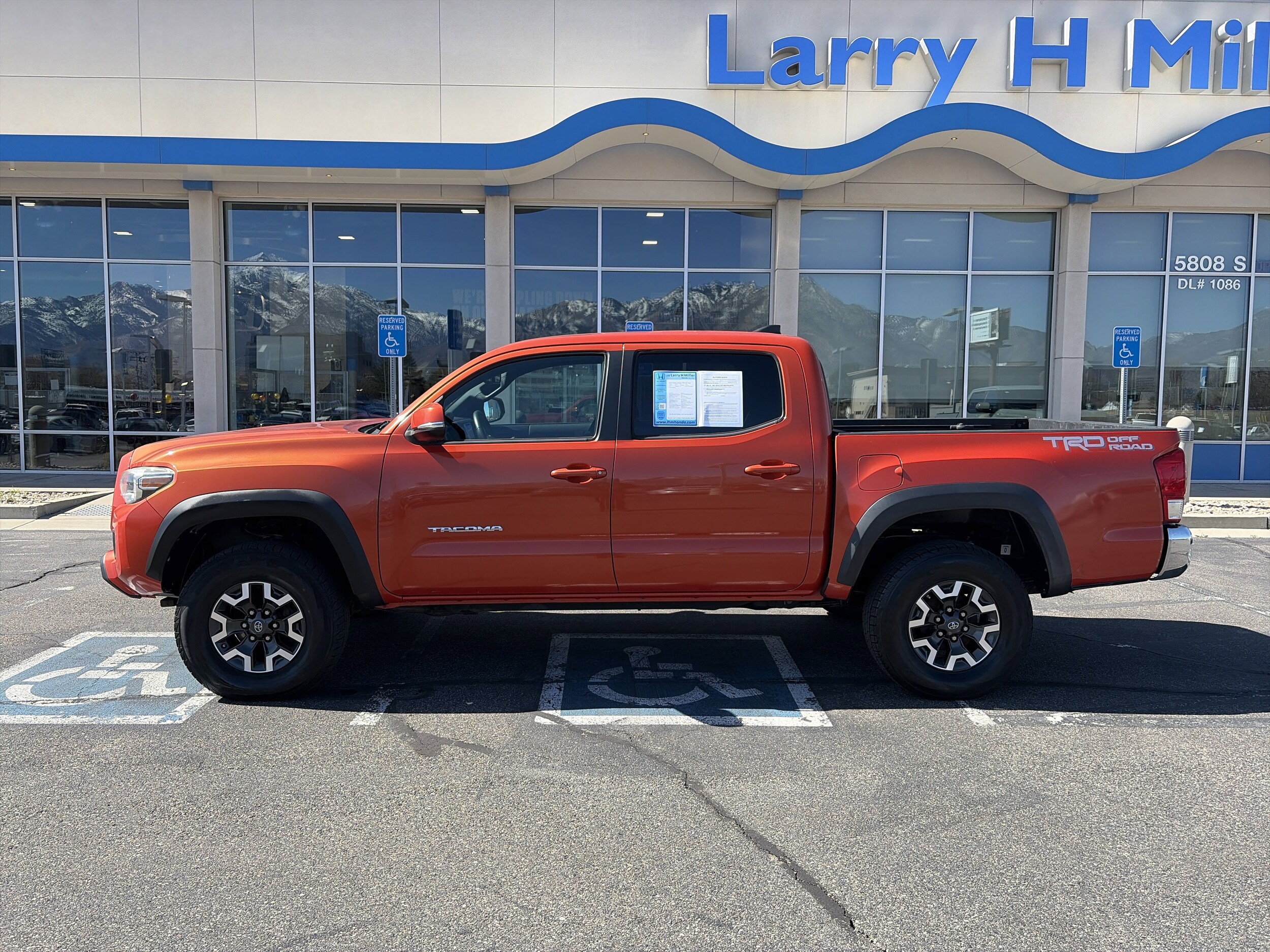Larry H. Miller Honda Murray offers this 2016 Inferno Toyota Tacoma TRD Offroad RWD. It is loaded with many standard and optional features including ABS brakes, Alloy wheels, Compass, Electronic Stability Control, Illuminated entry, Low tire pressure warning, Remote keyless entry, Traction control.
