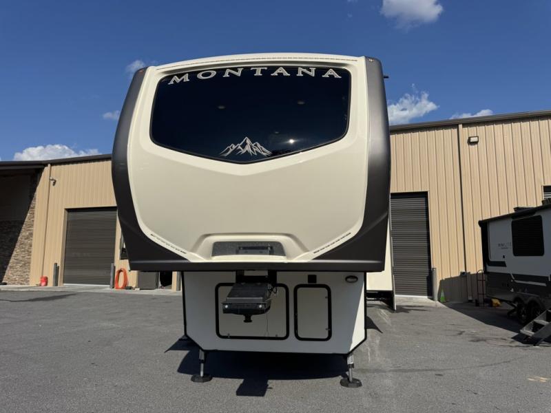 This Keystone Montana fifth wheel model 3820FK features a front raised kitchen that will make you feel like you haven't left home. There are five slides throughout the unit giving you plenty of space to move about. There are also dual entry doors, plus more, come check it out! Step inside the rear most entry door and find a conveniently located bathroom almost across from the door. Inside you will find a 48" x 30" shower, toilet, and vanity with sink. Head left at the same rear most entry and find the master bedroom which features dual opposing slide outs. A slide out wardrobe along the curb side, and a slide out queen or optional king size bed along the road side. The bed features storage beneath that is perfect for extra bedding, and luggage. Near the front of the bed along the shared bathroom wall you will find a washer and dryer prepped space for added convenience if you like. Down the hall toward the front of this Montana fifth wheel you will enter a spacious central living area thanks to another set of dual slide outs. Here the slide outs each feature a hide-a-bed sofa. Along the interior wall shared with the bathroom enjoy an HDTV and optional fireplace. There is also a set of theater seats opposite allowing for plenty of seating and sleeping space for overnight guests. Head up the steps just to the right of the second side entry door into the raised front kitchen. Here you will see a slide out buffet with overhead cabinets for plenty of storage. A u-shaped dinette fits across the front for gathering to enjoy a meal cooked easily with this great setup. There is an L-shaped counter with a double sink, a three burner range with overhead convection microwave oven, and an 18 cu. ft. RV refrigerator, plus center skylight. You will also love the exterior storage for outer camping gear, plus so much more!