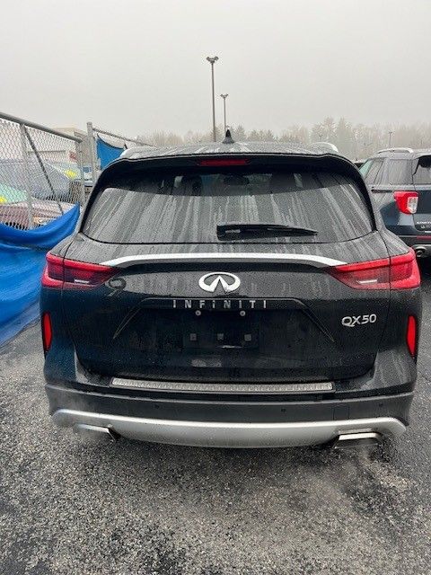 Black Obsidian 2019 INFINITI QX50 Essential AWD CVT I4 2-Way Passenger Power Lumbar, 4-Wheel Disc Brakes, 5.846 Axle Ratio, 6 Speakers, ABS brakes, Adaptive Front Lighting System, Advanced Climate Control System, Air Conditioning, AM/FM radio: SiriusXM, AM/FM/CD Audio System, Anti-whiplash front head restraints, Auto-dimming Rear-View mirror, Automatic temperature control, Back-Up Collision Intervention (BCI), Bose 16-Speaker Premium Audio System, Brake assist, Bumpers: body-color, CD player, Climate Controlled Seats, Delay-off headlights, Distance Control Assist, Driver door bin, Driver vanity mirror, Dual front impact airbags, Dual front side impact airbags, Electronic Stability Control, Emergency communication system: INFINITI Connection, Extended Interior Ambient Lighting, Exterior Parking Camera Rear, Floor Mats, Four wheel independent suspension, Front anti-roll bar, Front Bucket Seats, Front Center Armrest, Front dual zone A/C, Front fog lights, Front reading lights, Garage door transmitter: HomeLink, Headlamps (LED High/Low Beam), Heated door mirrors, Heated Front Seats, Heated Steering Wheel, Illuminated entry, Illuminated Kick Plates, Intelligent Cruise Control, Knee airbag, Leather Shift Knob, Low tire pressure warning, Memory Seats, Motion Activated Liftgate, Natural Maple Wood Interior Trim, Navigation system: INFINITI InTouch Navigation, Occupant sensing airbag, Outside temperature display, Overhead airbag, Overhead console, Panic alarm, Passenger door bin, Passenger vanity mirror, Power door mirrors, Power driver seat, Power Liftgate, Power moonroof, Power passenger seat, Power steering, Power Tilt & Telescopic Steering Wheel, Power windows, ProASSIST Package, Rain sensing wipers, Rear air conditioning, Rear anti-roll bar, Rear Cross Traffic Alert, Rear reading lights, Rear seat center armrest, Rear Side Window Sunshades, Rear window defroster, Rear window wiper.