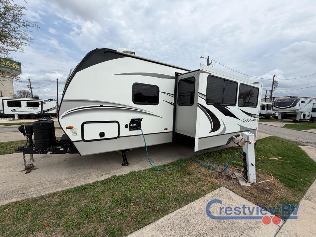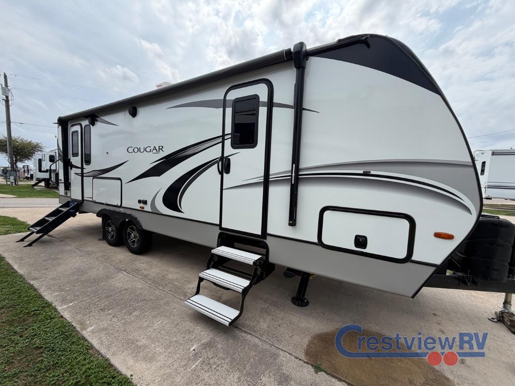 Keystone Cougar Half-Ton travel trailer 26RKS highlights: Dual Entry, Rear Kitchen, Large Slide, Outdoor Kitchen, Private Bedroom. Whether you like to get away to a private campsite in the woods or a local state park, this Cougar Half-Ton travel trailer will let you enjoy every place you go! The 68" tri-fold sleeper sofa and booth dinette are great for any overnight guests that join you while you sleep like a king on the king-size bed in the front private bedroom. The bedroom also has the second exterior entry door so that you can come and go as you please. Plus, everyone will enjoy having a summer barbecue outside at the outdoor kitchen. Check out the many different advantages that the Keystone Cougar Half-Ton fifth wheels and travel trailers have to offer! From its white high-gloss laminated side walls with 5-sided aluminum superstructure to its Climate Guard protection that offers a heated and enclosed underbelly and Astrofoil insulation, the Cougar Half-Ton is a brand full of quality and innovation. You'll also find that the interior will remain comfortable throughout all types of travel because of the 35,000 BTU furnace and the 15,000 BTU air conditioner. It's time to experience one of these Cougar Half-Ton for yourself because they are a force of nature!