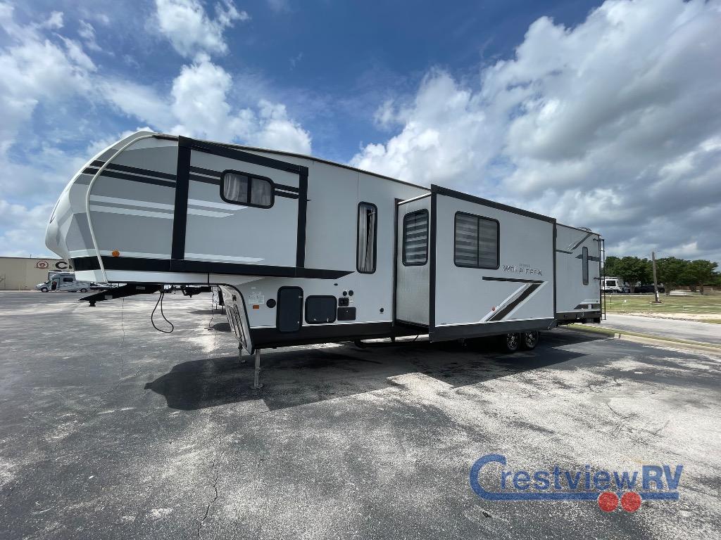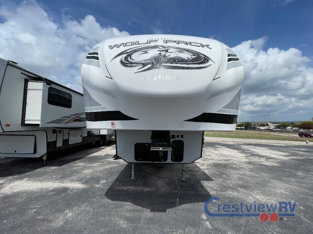 Forest River Cherokee Wolf Pack toy hauler 365PACK16 highlights: Wolf Pack King Bed, Outdoor Kitchen, Loft, Dual Entry, Full and Half Bath, 15' 10" Garage, "Party Patio". If your outdoors excursions include an ATV, dirt bikes, and plenty of riding gear, you need this spacious toy hauler fifth wheel. The 15' 10" separate garage includes its own half bath with folding walls so you can easily load your toys, plus the loft above provides sleeping space for the kids! The main living area is sure to be a big hangout spot with the party recliner sofa within the large slide, the table with bench seating, and the fireplace. If the weather is nice, you may just spend your whole day outdoors with the outside kitchen, and the two power awnings for maximum shade! After a day of entertaining, you will love retreating to the front master bedroom that includes a Wolf pack king bed, a slide out wardrobe and night stand, and your own door to the dual entry bath! The versatile Cherokee Wolf Pack toy haulers are ready for all your excursions! Each model includes a true high gloss gel coat, a 102" wide body design, and a forced air heated underbelly and enclosed holding tanks so you can camp year around. You will enjoy hassle-free features such as, the in cab tire pressure monitor system, the Happijac bed lift system, and the 100 gallon fresh water capacity. Each model includes a shower skylight, LED interior/exterior lights, Zebra shades in the living area, and a black stainless steel farm sink for that added touch-of-home. The fifth wheels include stabilizer jacks, a second 15K A/C unit in the bedroom, and 50 Amp service. You will appreciate 30 Amp service in the travel trailers, a power tongue jack, and ramp door cables. These toy haulers also include USB charging stations to keep all your gadgets charged and ready to go, premium Teddy Bear bunk mats for comfortability, and a reverse activated light and backup camera for easy loading and unloading!