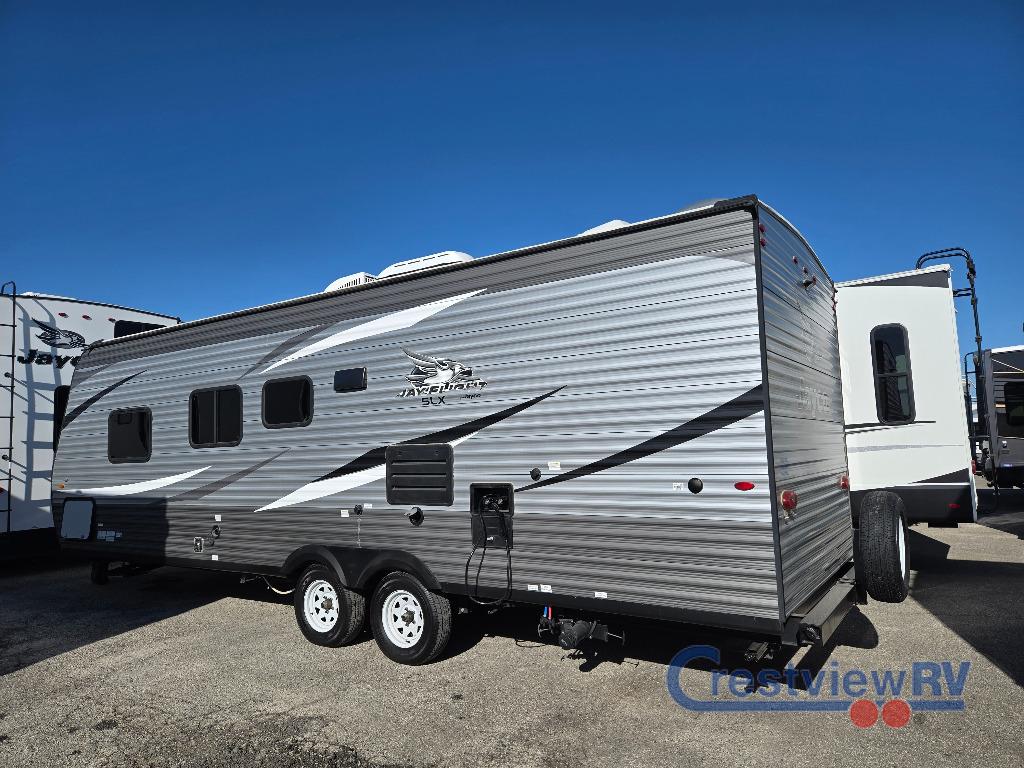 Jayco Jay Flight SLX 8 travel trailer 264BH highlights: Economical Family Friendly. The whole family can head to the campground with this travel trailer! Everyone will start each day feeling re-charged and ready to go after sleeping on the rear corner double bunk beds and the front queen bed, plus the sofa and the booth dinette can also transform into extra sleeping spaces for any friends that want to tag along. The rear corner bathroom comes with a tub/shower that has a skylight above for natural lighting and a wood trimmed mirror to make you feel more at home. There is plenty of storage inside and out between the overhead cabinets, the wardrobes, and the exterior pass-through storage area. You can also add the optional Chil N' Stor feature to the exterior so that you can enjoy a nice, cold beverage without having to go inside to get one! Enjoy family time with lots of room to stretch out in any one of these Jayco Jay Flight SLX 8 travel trailers! Jayco uses the top-quality materials and innovative manufacturing techniques to create the Magnum Truss Roof System for a 50% stronger roof than any other in the industry. The screwed construction creates a more firmly secured structure and the 2" x 2" vertical studs provide smoother edges for safer wiring to reduce the risk of electrical shorts. Each model comes with the mandatory Customer Value Package which includes extra luxurious features like the three burner range, Keyed-Alike entry and baggage doors, the outside shower, the JaySMART LED lighting, and the bedspread. The Goodyear Endurance tires, the front diamond plate, and the axles with electric, self adjusting brakes and galvanized steel impact resistant wheel wells ensure you will arrive safely to each destination. Come see just how comfortable these travel trailers are!