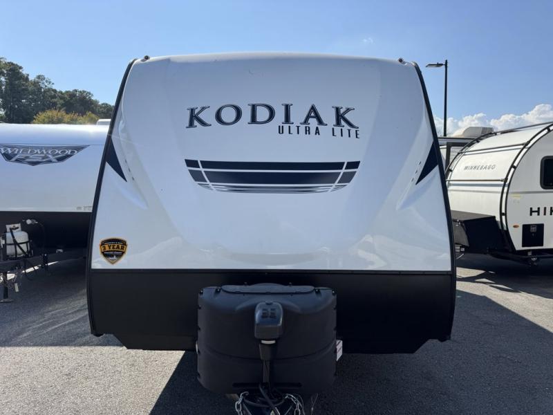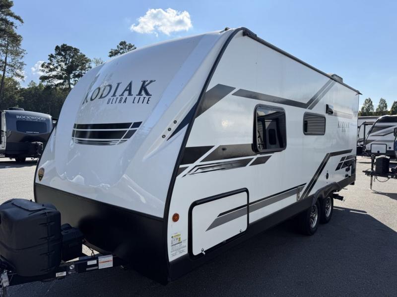Dutchmen Kodiak Ultra-Lite travel trailer 201QB highlights: Pass-Through Storage, Rear Bath, Wardrobes, 10-Cu. Ft. Refrigerator, Solid Entry Step. If you have been thinking about owning an RV and you want a model that will not only look stylish, but will also provide durability, then take a look at this Kodiak Ultra-Lite travel trailer. This model is great for those who are new to the camping experience or for those who enjoy living on a smaller scale. Imagine being able to cook inside on the three-burner range, eat together at the booth dinette, and take advantage of the full bathroom amenities, all in a lightweight unit that is able to be towed by a variety of vehicles. At the end of each night, you will find it thoroughly relaxing to fall asleep on the residential queen bed. Let your next set of travel plans include the Dutchmen Kodiak Ultra-Lite travel trailer! You'll be glad you did when you find out that these trailers have an aluminum super-structure design making them perfect to tow behind most vehicles. You can use the central control station to operate your trailer's electrical functions, and you'll appreciate having a spare tire and carrier in the event of a mishap on the road. Sit outside underneath the power awning with LED lights each night to enjoy time spent together in the fresh air, and use the AM/FM/CD/DVD stereo and exterior speakers to provide some extra entertainment while you're outside.